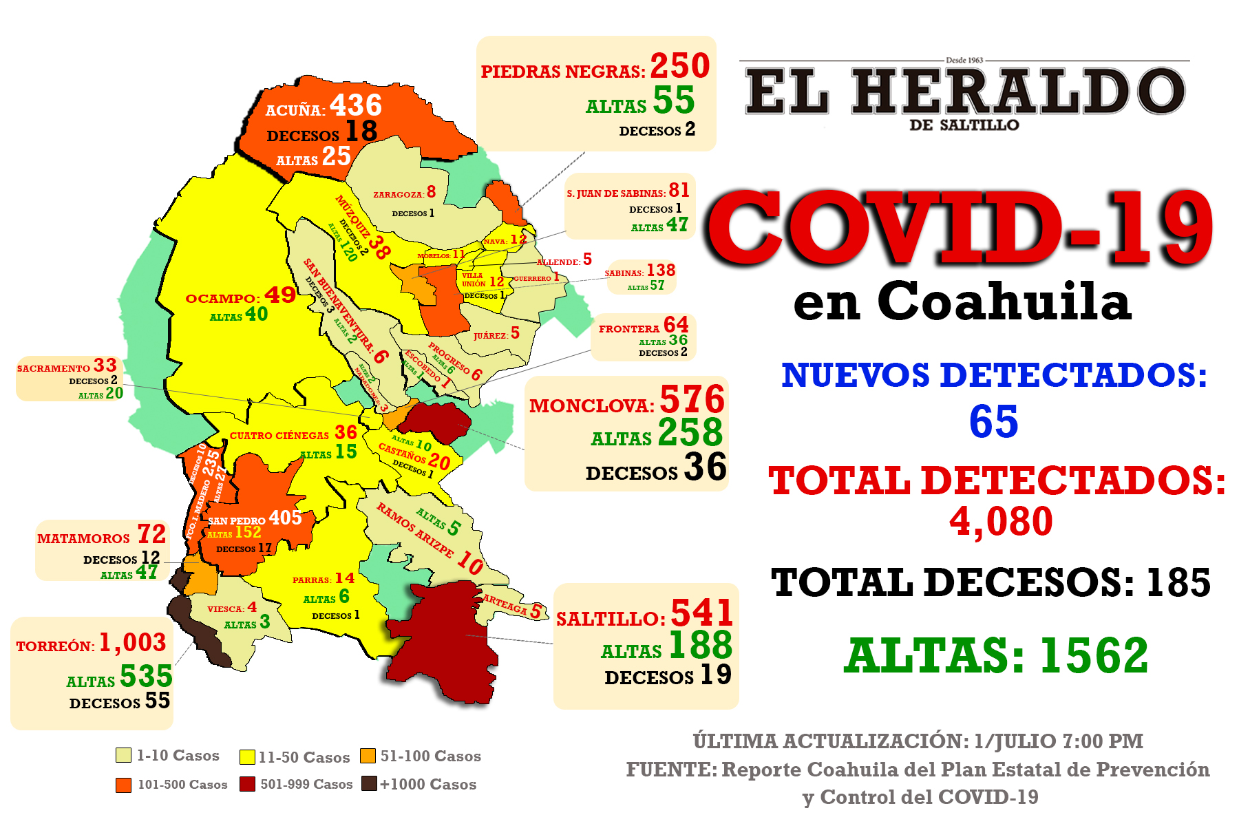 Se contabilizan en Coahuila en total 4 mil 80 casos – incluidos 185 decesos – distribuidos de la siguiente manera: