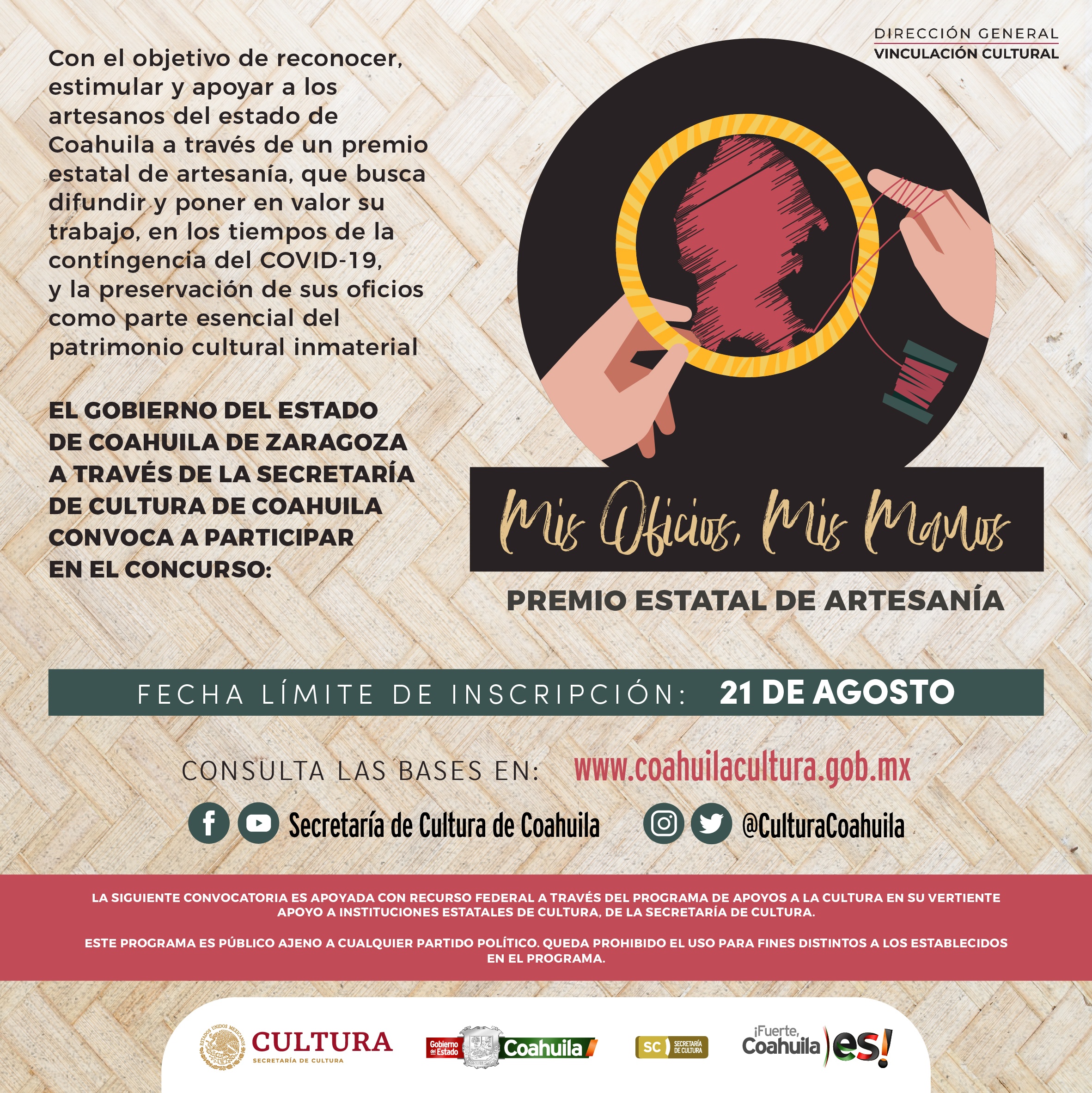 El Gobierno de Coahuila, a través de la Secretaría de Cultura, convoca a creadores de escénicos y artesanos de la entidad a participar en el Programa Territorio Escénico y en el Premio Estatal de Artesanía, respectivamente.