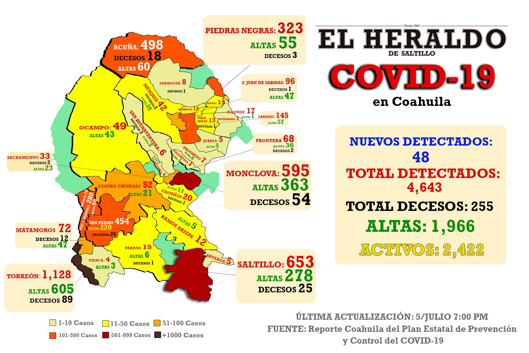 Se contabilizan en Coahuila en total 4 mil 643 casos -incluidos 255 decesos- distribuidos de la siguiente manera: