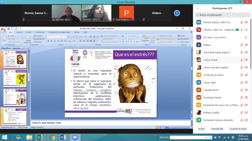 Las psicólogas Elidia Triana Carrillo y Luz María Vera Ruiz, del CJEM en Torreón, realizaron una plática mediante la plataforma Zoom, dirigida a personal administrativo, docente y alumnado de la UPRA, con los temas de motivación laboral y estrés, esto como una medida para mantener la salud emocional y psicológica de los alumnos y personal que labora en dicha universidad, que se han producido por el aislamiento derivado de la contingencia del Covid-19.