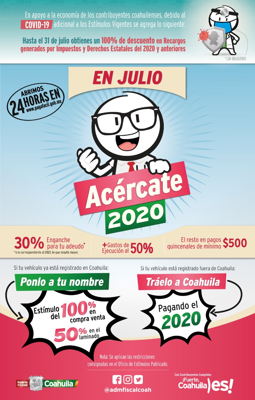 “Invitamos a todos los coahuilenses que deseen cubrir sus adeudos de una manera más accesible para su economía, a que durante este mes de julio aprovechen los distintos apoyos que el Gobierno de Coahuila tiene para ustedes”.