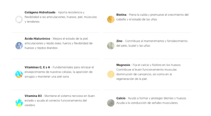 Por ejemplo, en un caso de necesidad de fortalecimiento de cabello el test recomendó como nutrientes principales, colágeno hidrozilado, ácido hialurónico, Vitaminas C,E y A, Vitamina B3, Biotina y Zinc.
