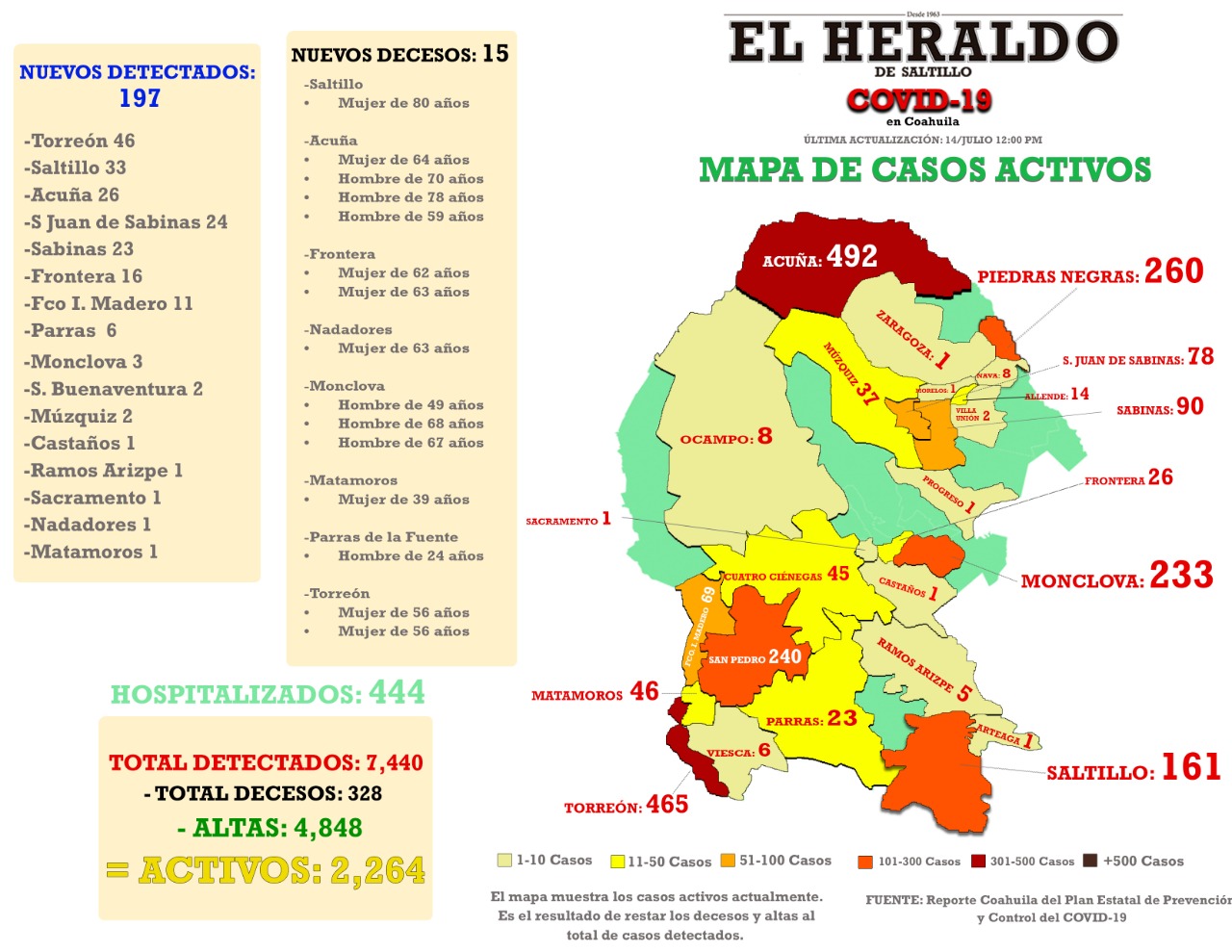 Hasta este martes se contabilizan en Coahuila en total 7 mil 440 casos -incluidos 328 decesos-.