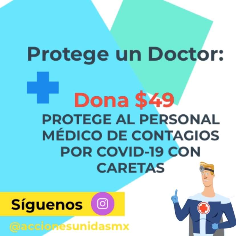 La organización Acciones Unidas hizo un llamado a los saltillenses para apoyar en la campaña denominada “Protege un Doctor”, la cual se realiza con el objetivo de dotar de equipo de protección al personal médico de esta ciudad que presta sus servicios en diferentes hospitales de esta ciudad, en la primera línea de batalla contra el COVID-19.