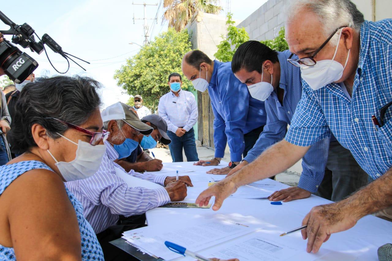 Jericó Abramo Masso, titular de la SEVOT, presenció junto al alcalde José María Morales Padilla la firma de 97 títulos de propiedad en la Colonia La Soledad, de este municipio.