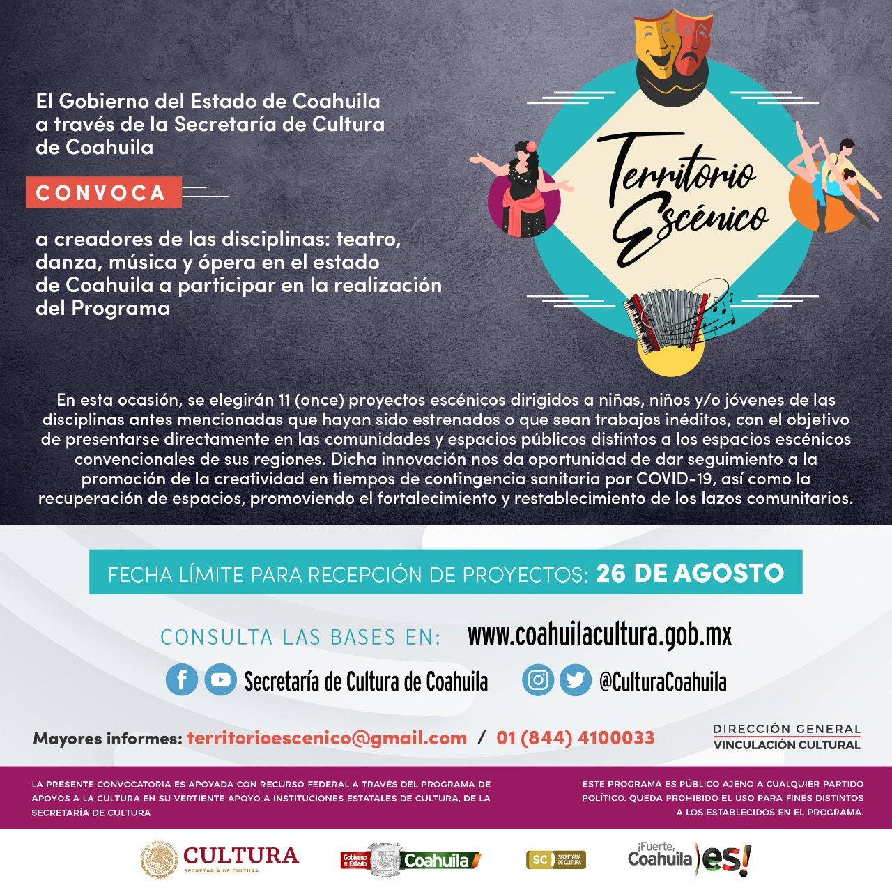 La Secretaría de Cultura de Coahuila, en coordinación con los proyectos culturales de Apoyo a Instituciones Estatales de Cultura AIEC, invita a creadores de las disciplinas de teatro, danza, música y ópera coahuilenses a participar en la convocatoria Territorio Escénico 2020.