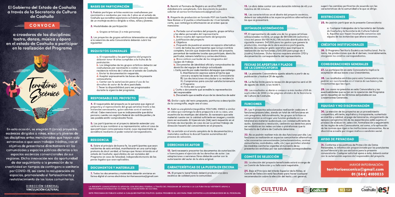 Detalló que los interesados pueden acceder a la convocatoria completa en el siguiente enlace: https://coahuilacultura.gob.mx/convocatorias/convocatoria-territorio-escenico/.