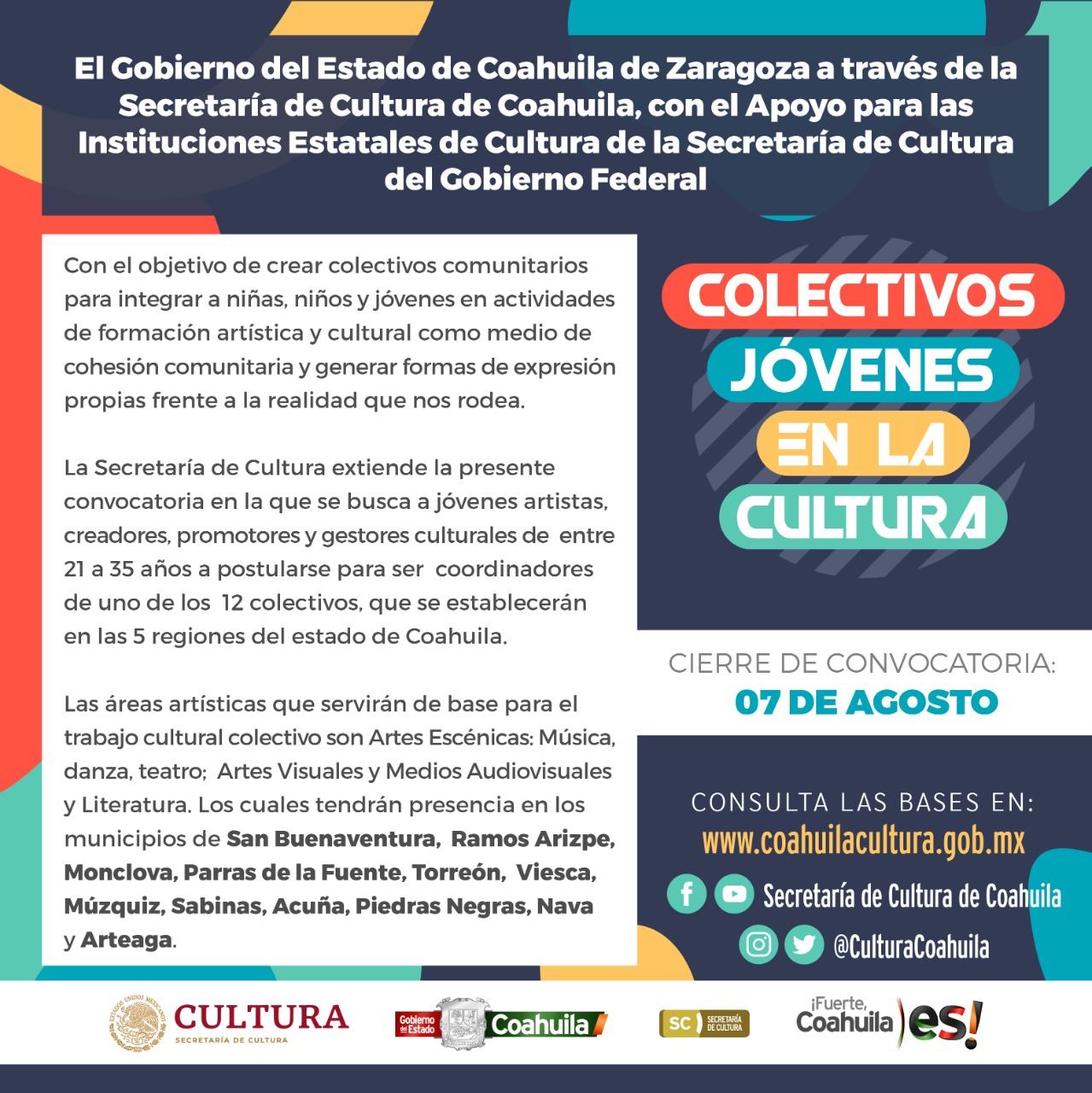 Con el objetivo de integrar a jóvenes coahuilenses en actividades de formación artística y cultural, llega a Coahuila la convocatoria “Colectivos Jóvenes en la Cultura”, misma que queda abierta a partir de su publicación y hasta el 7 de agosto del presente año a las 12:00 horas.