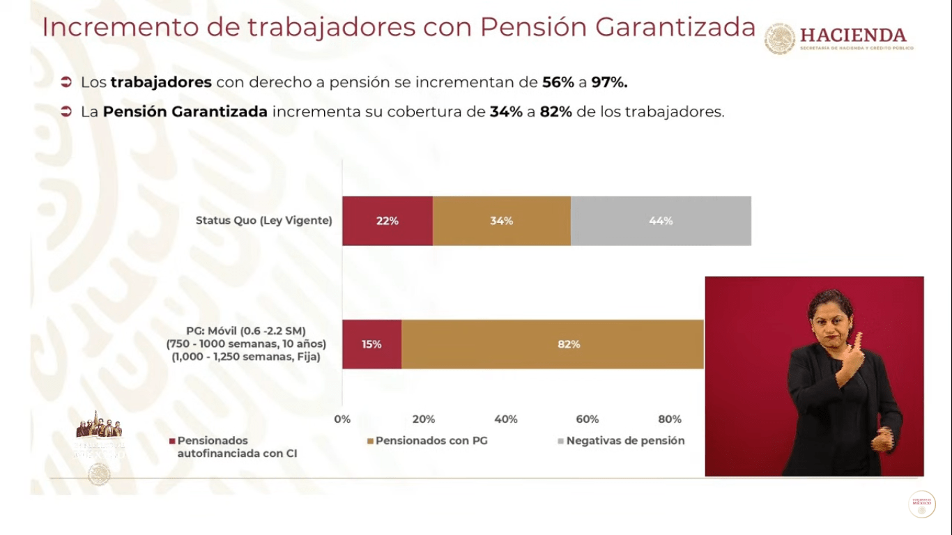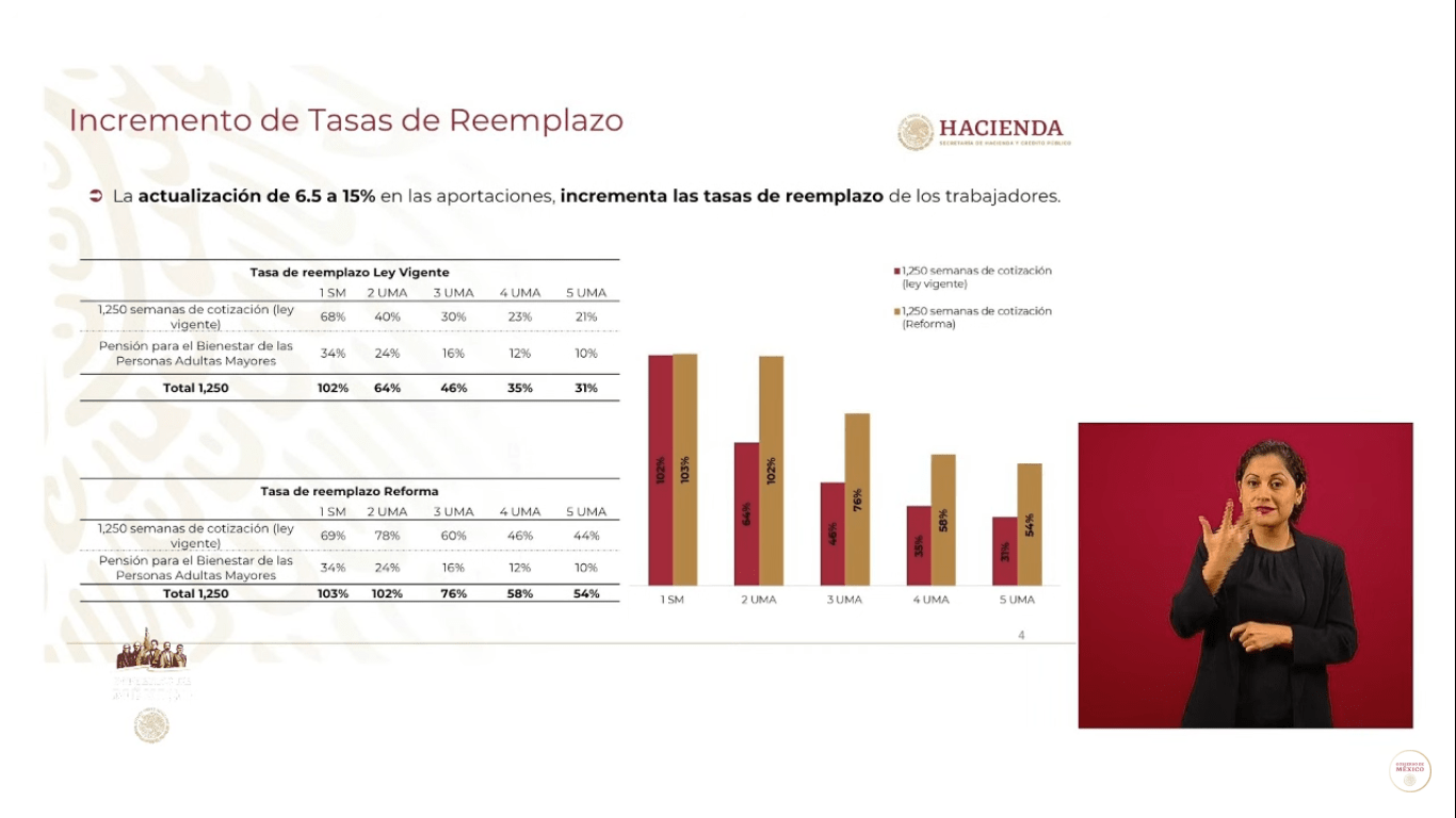 «Se va a elevar la tasa de reemplazo de los trabajadores en un promedio de 40 por ciento y los trabajadores que menos recibían, que tenían hasta cinco salarios mínimos, van a aumentar de un 31 por ciento a un 54 por ciento su tasa de reemplazo», dijo.