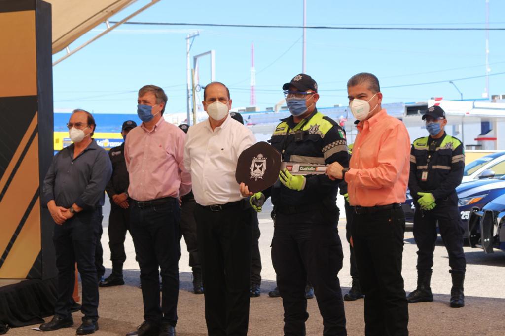 Durante su visita a Piedras Negras, el gobernador Miguel Riquelme atestiguó la entrega de parque vehicular a la Dirección de Seguridad Pública Municipal, con recursos del Fortaseg, así como equipo de salud para los elementos de la corporación.