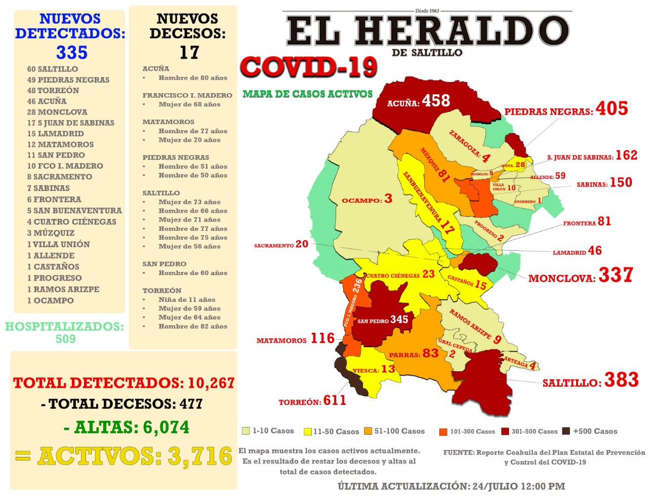 Se contabilizan en Coahuila en total 10 mil 267 casos – incluidos 477 decesos-.
