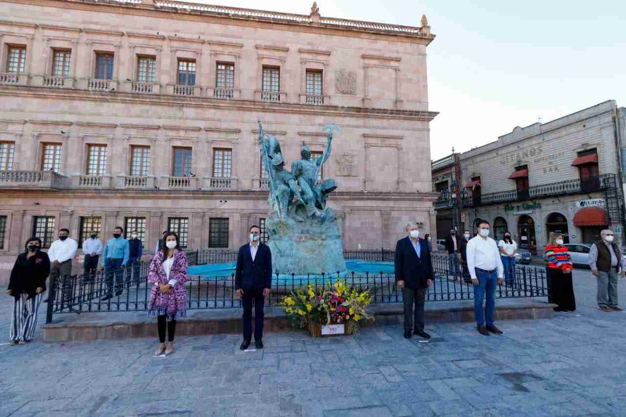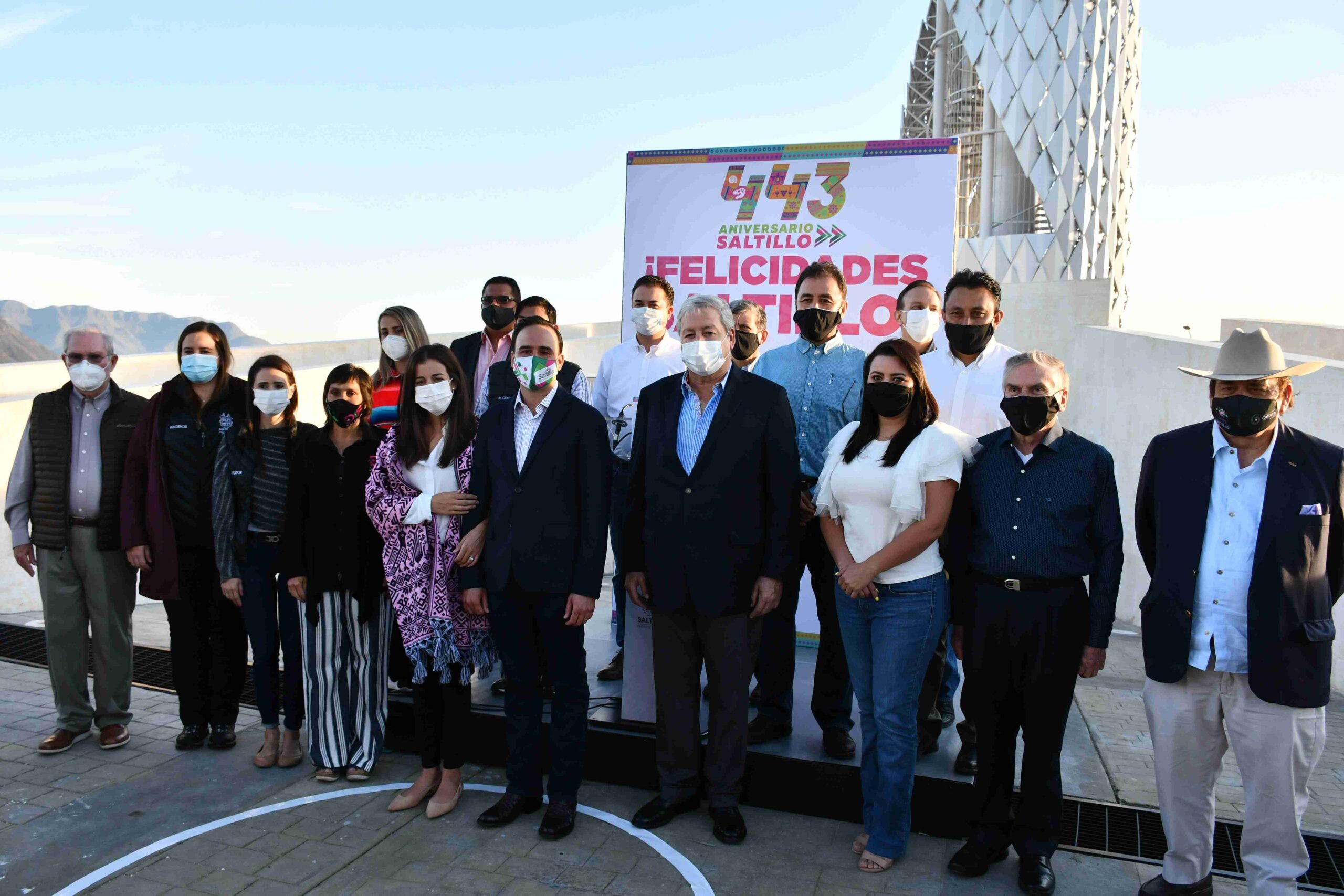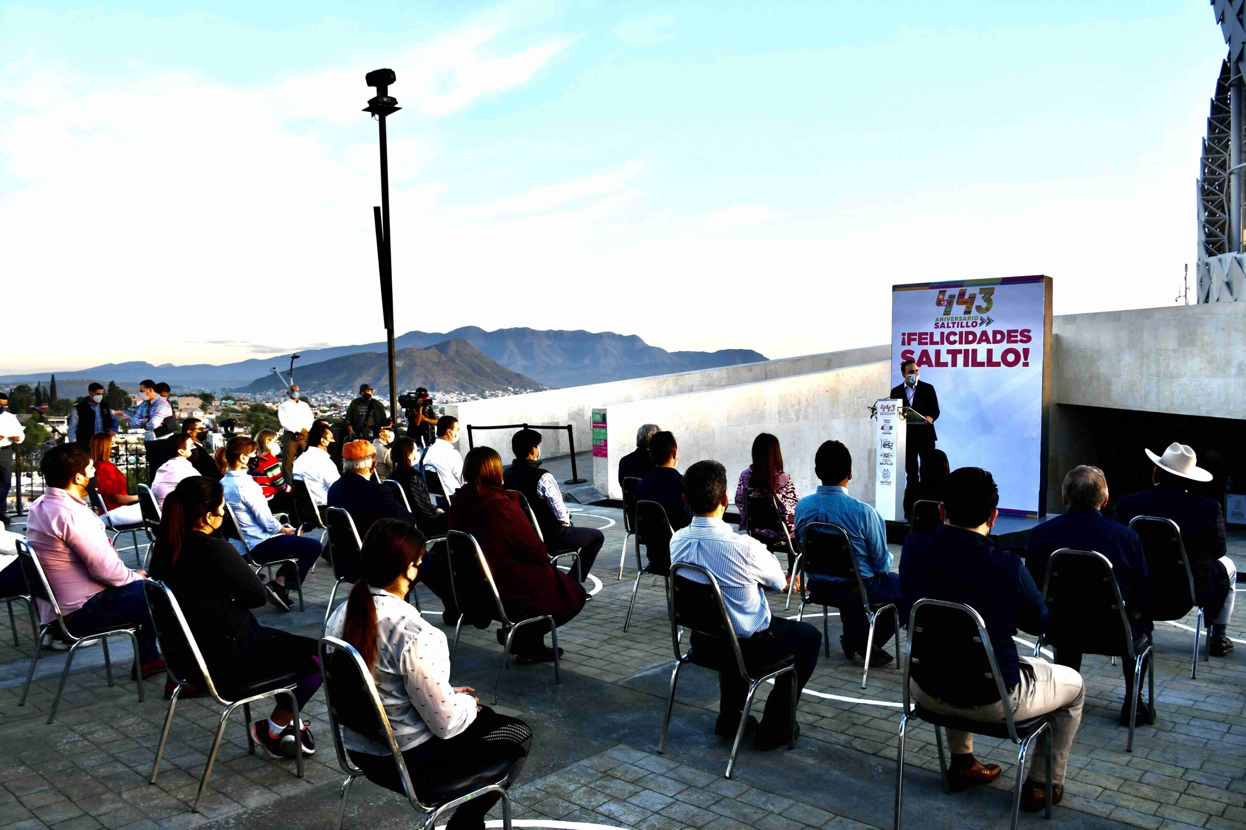 El alcalde de Saltillo Manolo Jiménez Salinas encabezó este sábado el festejo por el 443 aniversario de la ciudad de una manera diferente debido a las circunstancias en que la pandemia ha orillado el actuar de la sociedad en esta nueva normalidad.