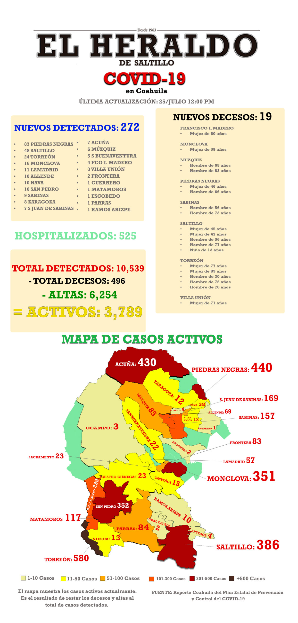 De acuerdo al Plan Estatal de Prevención y Control, emitido por la Secretaría de Salud de Coahuila, se informa que hasta este sábado se registran 272 nuevos casos de COVID-19 en la entidad, incluidas 19 defunciones.