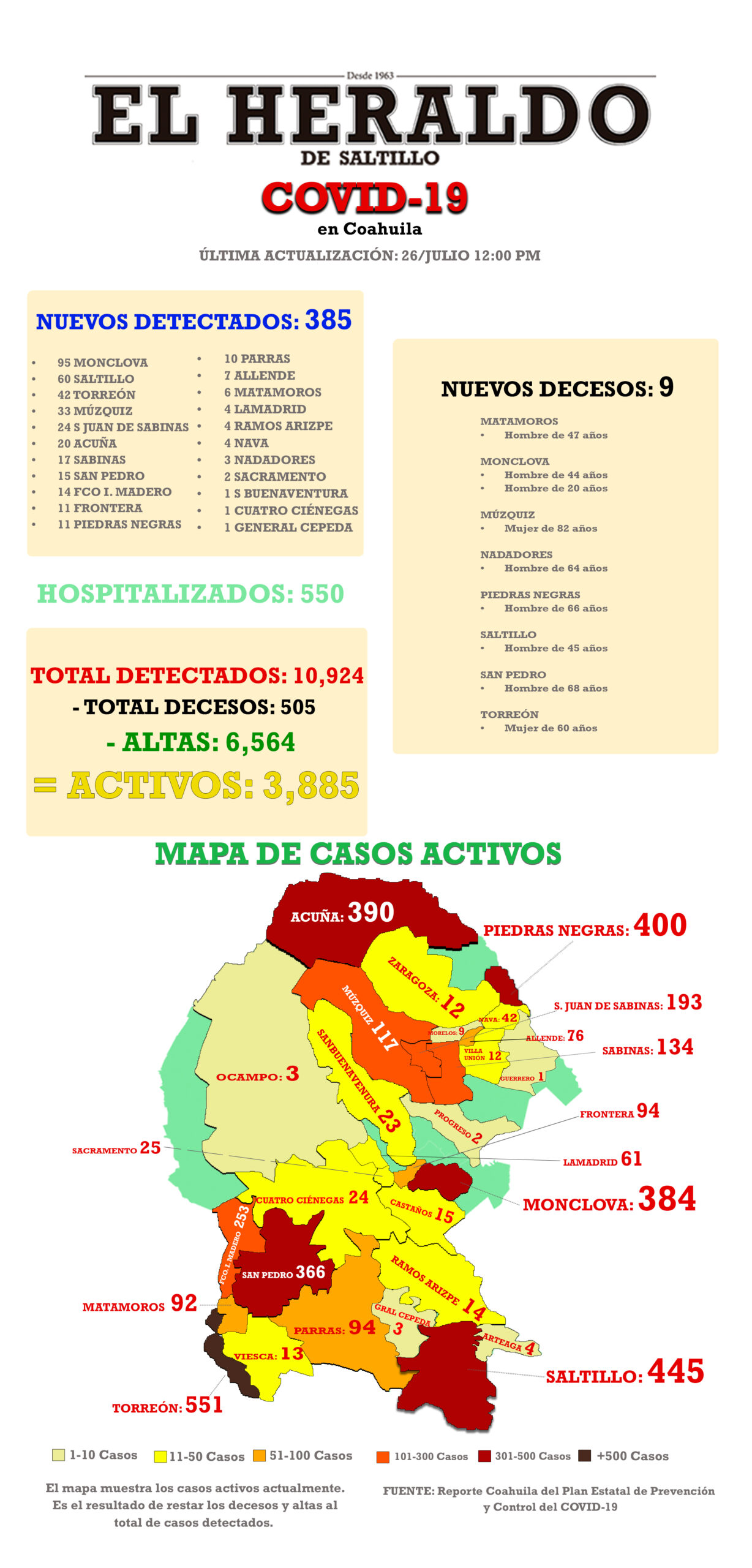 De acuerdo al Plan Estatal de Prevención y Control, la Secretaría de Salud de Coahuila (SS) informa dio a conocer que hasta este domingo se registran 385 nuevos casos de Covid-19 en la entidad, incluidas 9 defunciones.