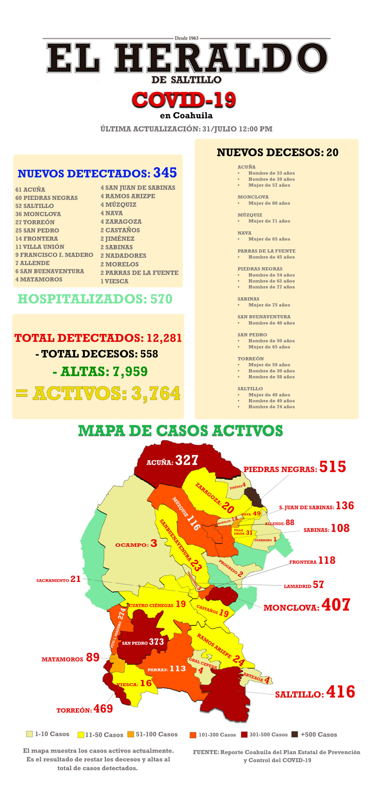 De acuerdo con el Plan Estatal de Prevención y Control, la Secretaría de Salud de Coahuila (SS) informa que hasta este viernes se registran 345 nuevos casos de COVID – 19 en la entidad, incluidas 20 defunciones: