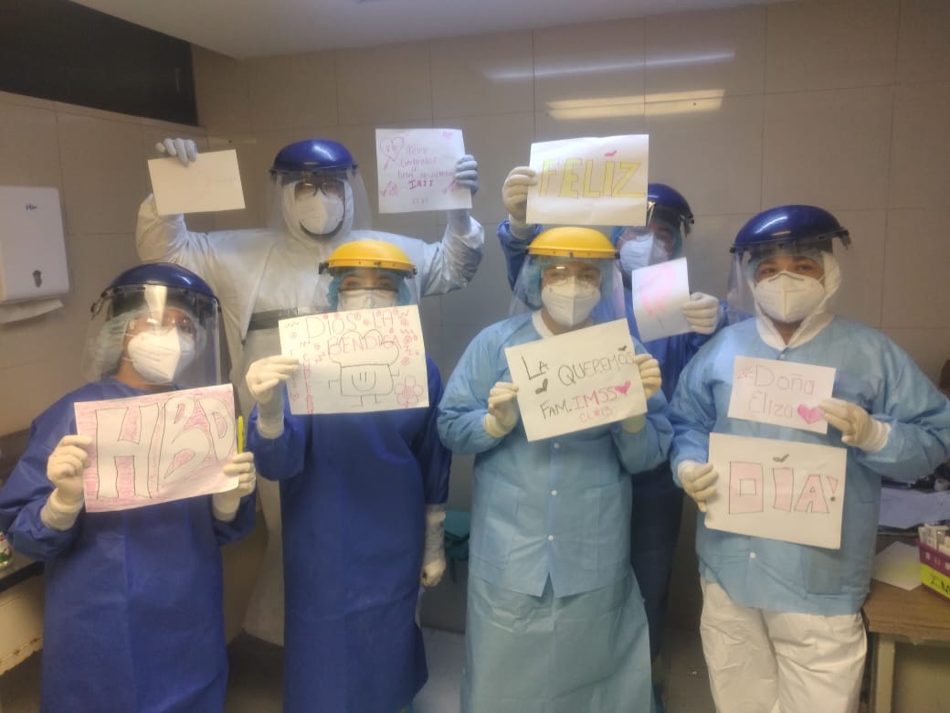 Acuña, Coahuila.- En punto de las 12:00 horas, el personal del área COVID-19 del Hospital General de Subzona (HGSZ) No. 13 del Instituto Mexicano del Seguro Social (IMSS) en Ciudad Acuña, Coahuila, acudió a la cama de doña Eliza, paciente que tiene casi un mes hospitalizada, a cantarle las mañanitas y a decorar su cubículo para celebrar su cumpleaños.