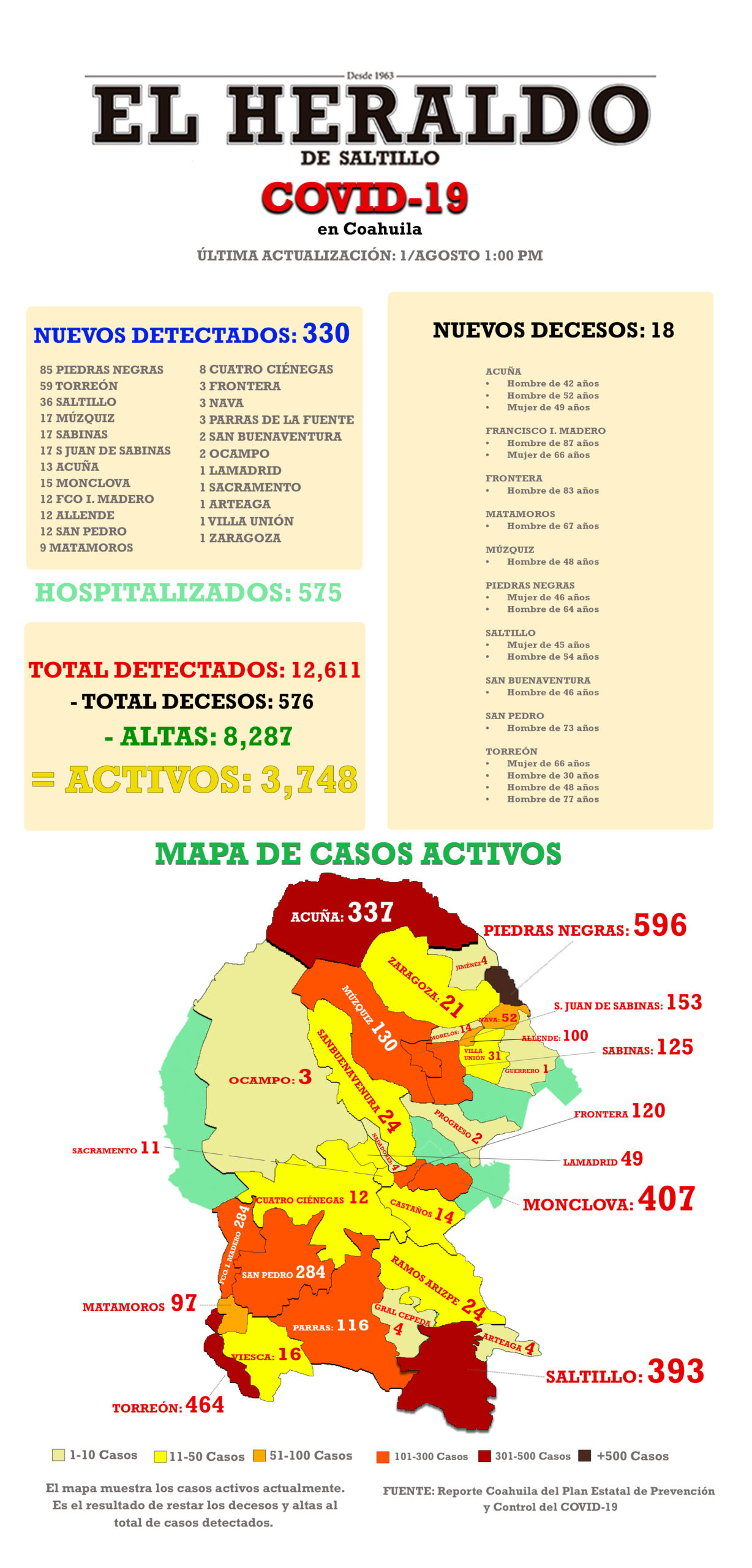 De acuerdo al Plan Estatal de Prevención y Control, la Secretaría de Salud de Coahuila (SS) informa que hasta este sábado se registran 330 nuevos casos de COVID – 19 en la entidad, incluidas 18 defunciones: