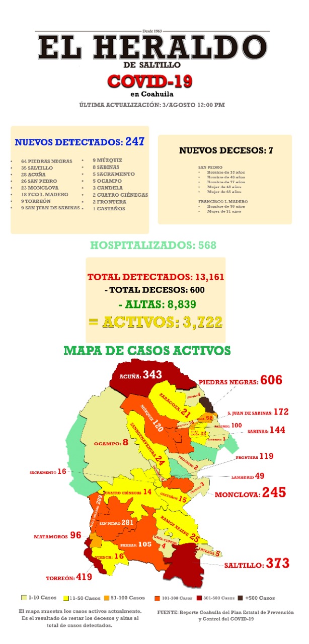 De acuerdo al Plan Estatal de Prevención y Control, la Secretaría de Salud de Coahuila dio a conocer que hasta este lunes se registran 247 nuevos casos de COVID – 19 en la entidad, incluidas 7 defunciones: