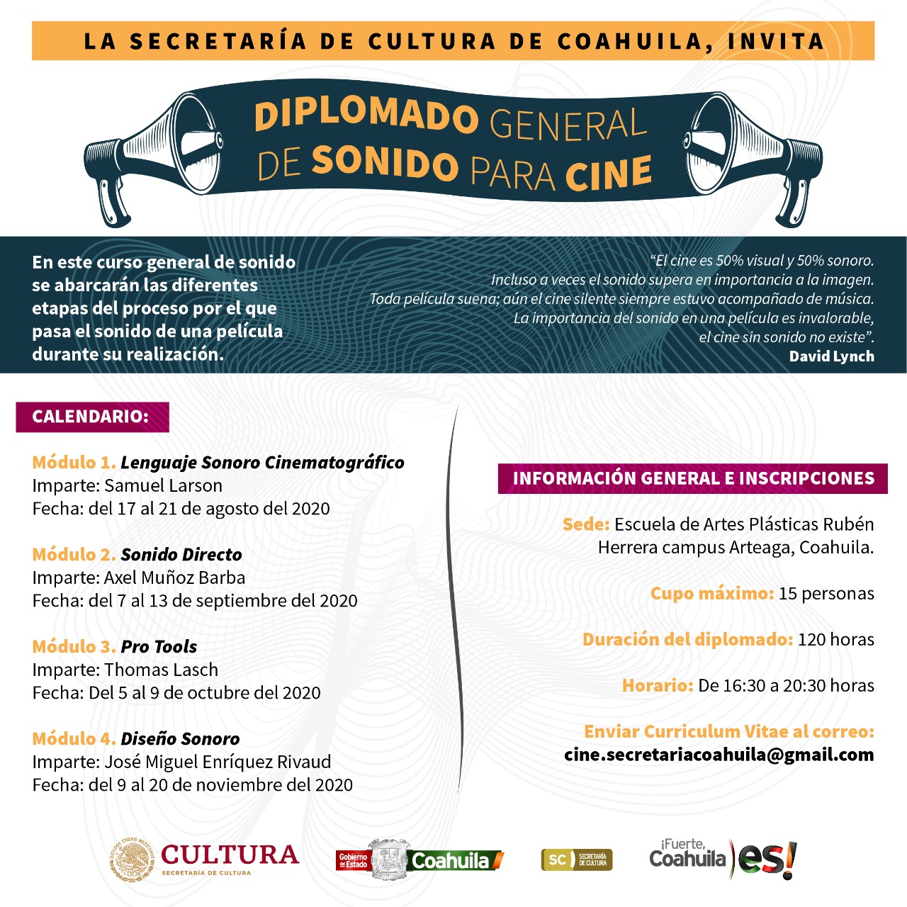 Las Secretaría de Cultura de Coahuila (SC), en coordinación con la Secretaría de Cultura Federal —y a través del Programa de Apoyos a las Instituciones Estatales de Cultura—, la Universidad Autónoma de Coahuila y el Centro de Capacitación Cinematográfica,mantiene abierta la invitación a participar en el diplomado del Programa de Profesionalización de Artistas Coahuilenses en medios audiovisuales.