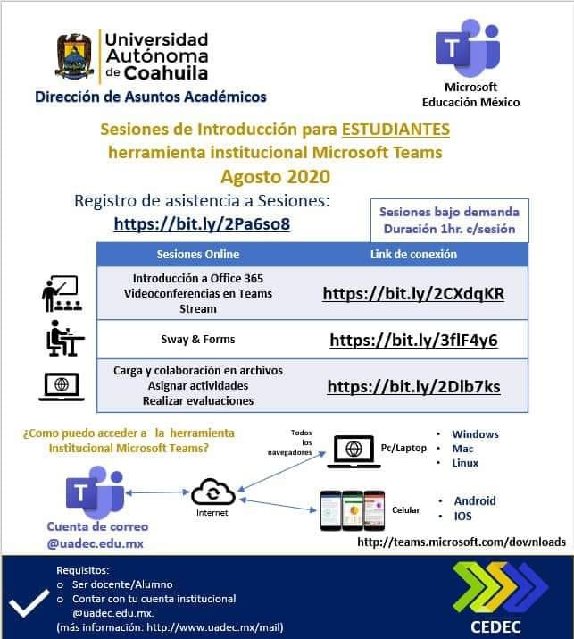 La Dirección de Asuntos Académicos de la Universidad Autónoma de Coahuila convoca a los estudiantes de reingreso y nuevo ingreso a las sesiones de introducción a la herramienta institucional Microsoft Teams.