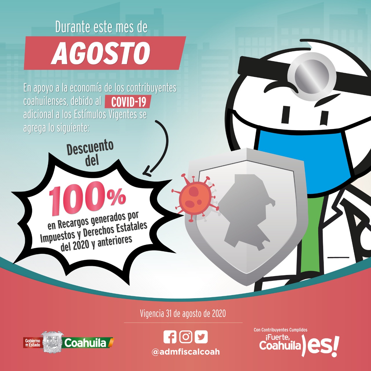 Javier Díaz González, Administrador Fiscal de Coahuila, compartió que continúa el apoyo económico a la ciudadanía coahuilense hasta el último día de agosto, y obtienen un 100 por ciento de descuento en recargos generados por Impuestos y Derechos Estatales del 2020 y anteriores.