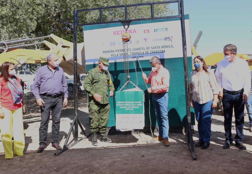 Guerrero, Coah.- “Coahuila ha fincado su estrategia en materia de seguridad en una gran alianza con el Ejército Mexicano”, aseveró el gobernador Miguel Ángel Riquelme Solís al encabezar la ceremonia de colocación de la primera piedra del Cuartel Militar para Cinco Manantiales, ubicado en el Ejido Santa Mónica, con inversión de 18 millones de pesos.
