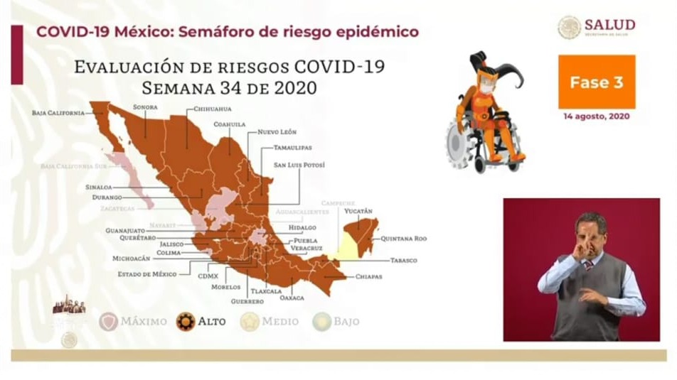 En cuanto al nivel rojo, que es el de máxima alerta de contagio, hay seis estados de la República que están en este color: Hidalgo, Aguascalientes, Colima, Nayarit, Zacatecas y Baja California Sur.