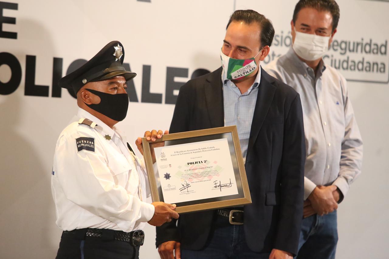Como parte del proyecto de profesionalización de la policía municipal, el alcalde de Saltillo, Manolo Jiménez Salinas, entregó grados policiales a aquellos elementos que fueron elegidos mediante una convocatoria que se realizó de manera abierta y transparente, en un procedimiento sin precedente en este municipio.