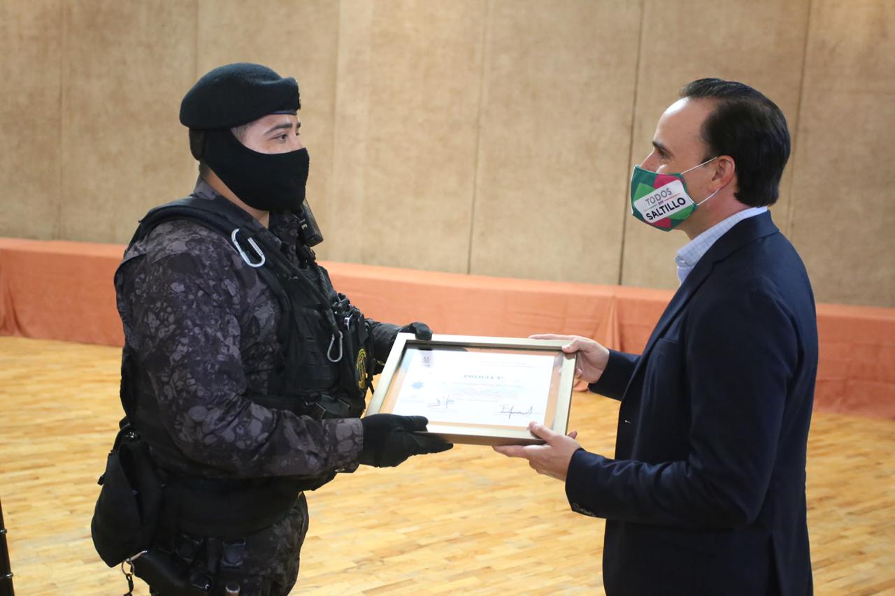 “Nos sentimos sumamente orgullosos de ustedes, que Saltillo tenga, según el INEGI, una de las mejores policías a nivel nacional no es obra de la casualidad, sino que es gracias al trabajo de mujeres y hombres echados pa’ delante como ustedes y de todos quienes se involucran en el tema de seguridad», afirmó el Alcalde.