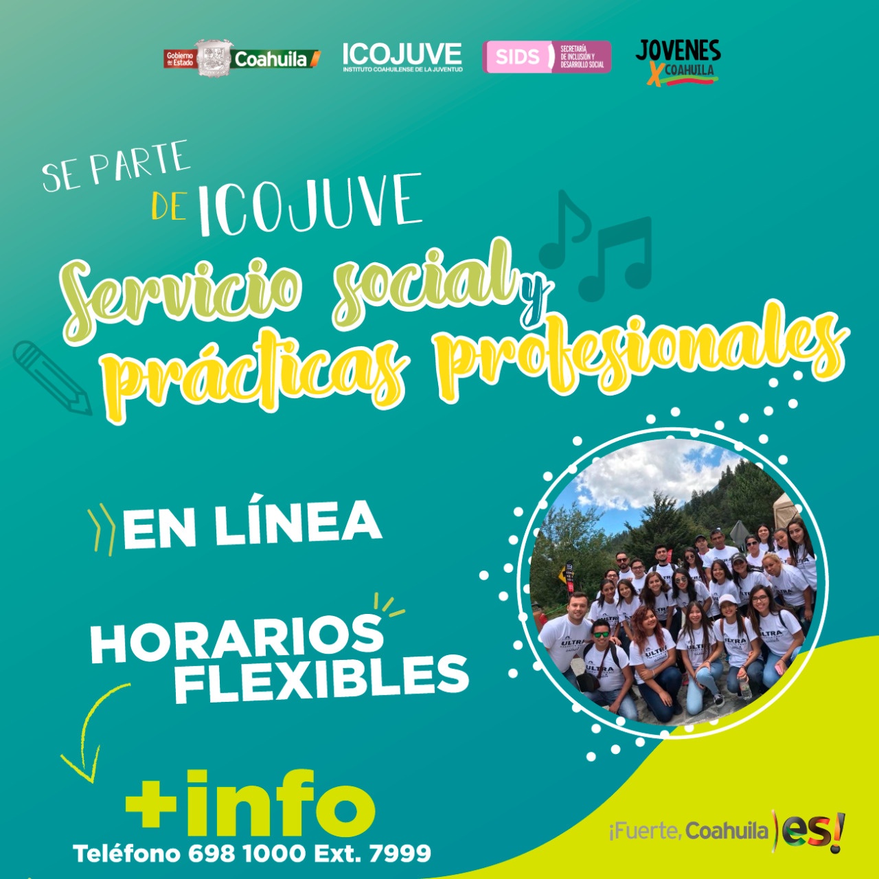 Con la finalidad de concientizar a la juventud coahuilense sobre la importancia de la participación ciudadana, social, pública y política, la Secretaría de Inclusión y Desarrollo Social, a través del Instituto Coahuilense de la Juventud (ICOJUVE), convoca a las y los jóvenes que deseen realizar el servicio social o sus prácticas, o a que acudan a las instalaciones del ICOJUVE en Saltillo y Torreón, a fin de contribuir con la comunidad estudiantil para que cumpla con este requisito.