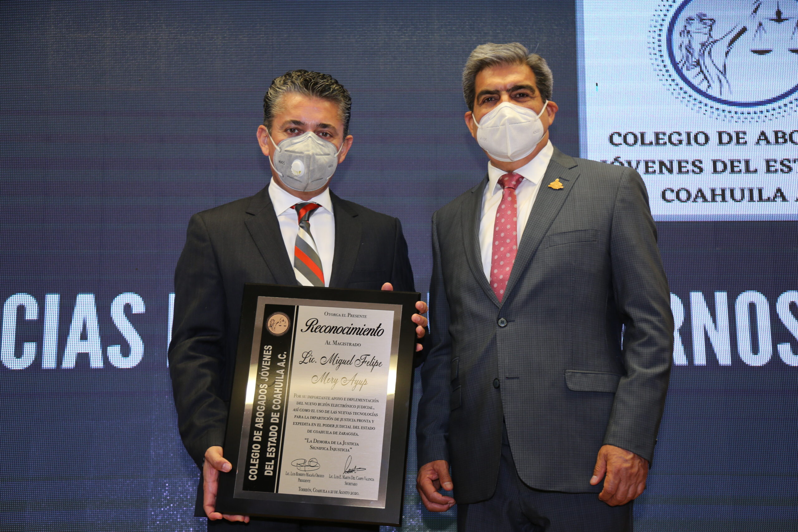 Además del homenajeados, se contó con la participación en presídium de Raúl Martínez Hernández, rector de la Universidad Tecnológica de Torreón; y Luis Roberto Magaña Orozco presidente del Colegio de Abogados Jóvenes del Estado de Coahuila.