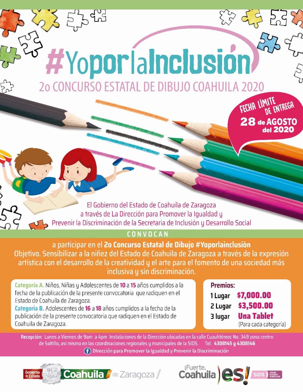 La Secretaría de Inclusión y Desarrollo Social del Estado (SIDS), a través de la Dirección para Promover la Igualdad y Prevenir la Discriminación (DPIPDC), da a conocer el cierre de la convocatoria del segundo concurso de dibujo #YoPorLaInclusión, este viernes 28 de agosto del 2020, fecha límite para presentar tu dibujo y participar activamente construyendo sociedades más inclusivas con la expresión artística, desarrollando la creatividad.
