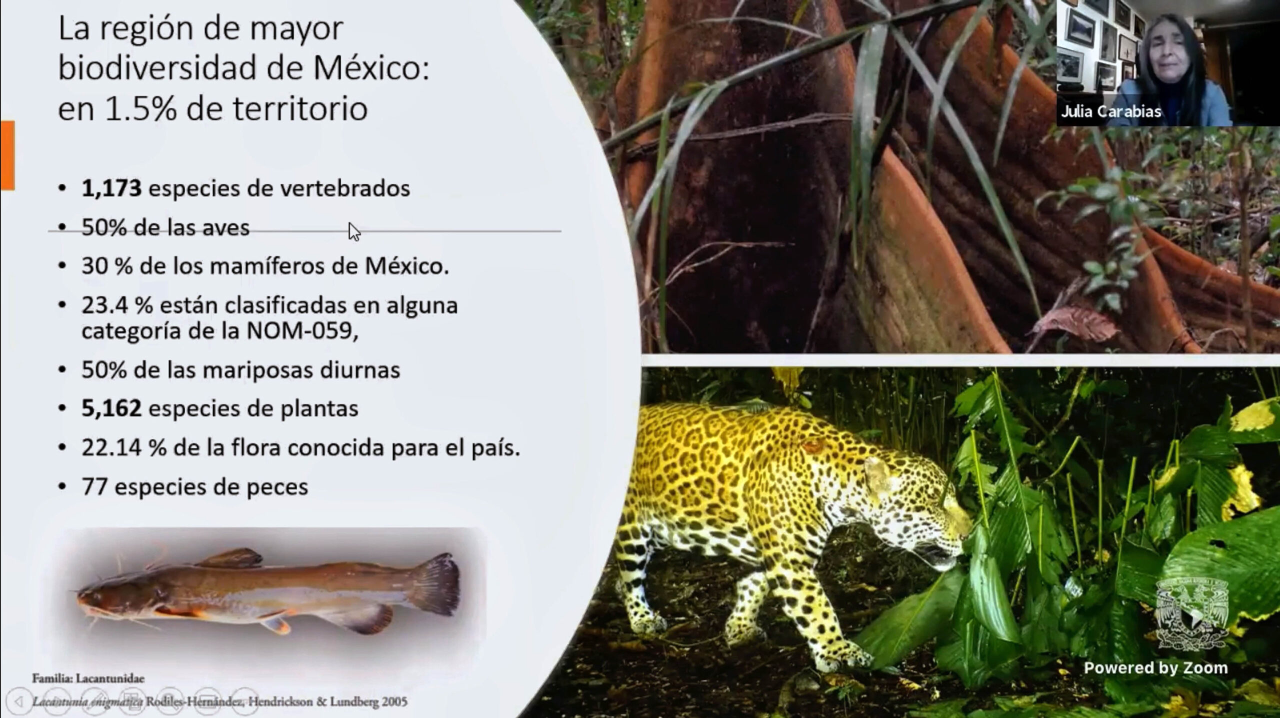 Al participar en el seminario internacional virtual “Tópicos de Frontera en la Sustentabilidad”, dedicado al tema Gobernanza y Sustentabilidad en Regiones Transfronterizas, explicó que esta zona, ubicada al sur, ocupa el 1.5 por ciento del territorio nacional, y contiene mil 173 especies de vertebrados, 50 por ciento de las aves que existen en el país y 30 por ciento de los mamíferos.