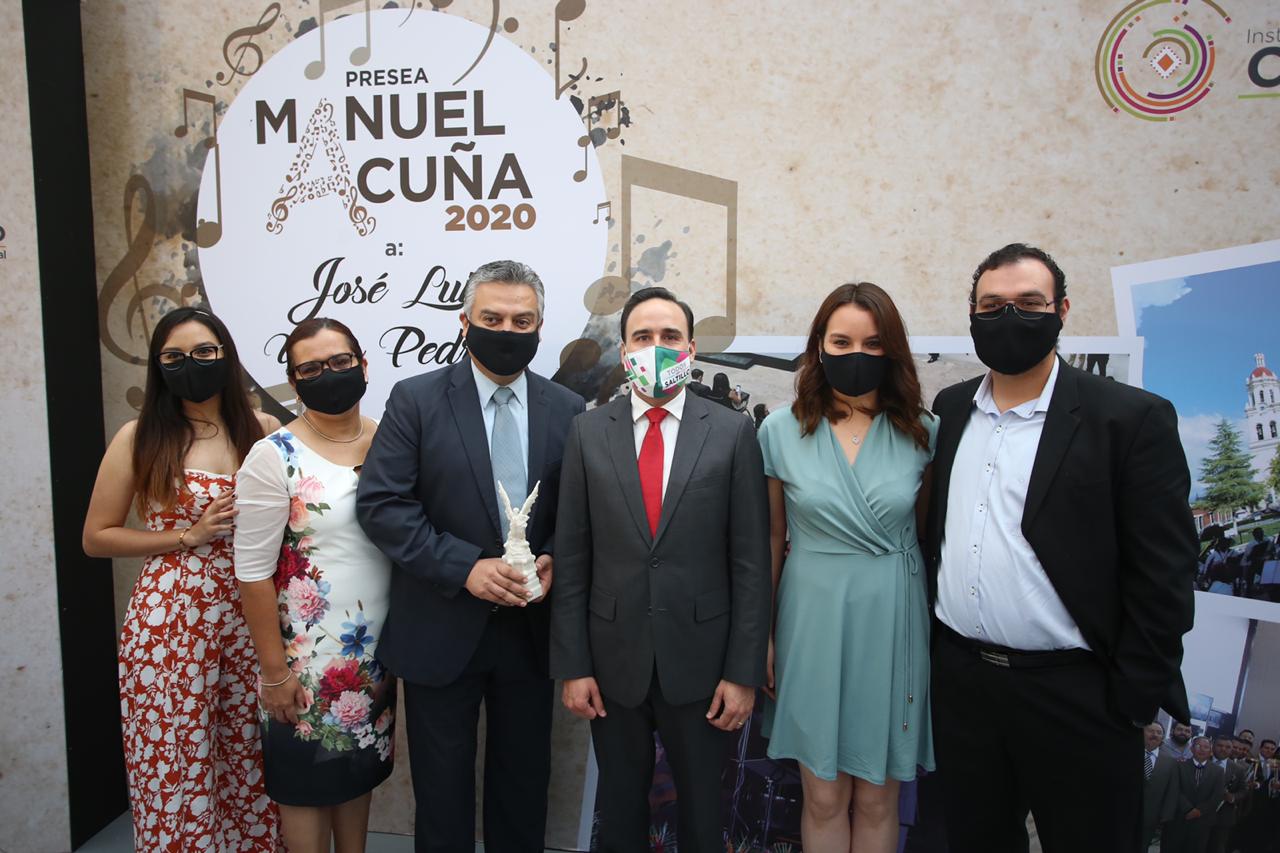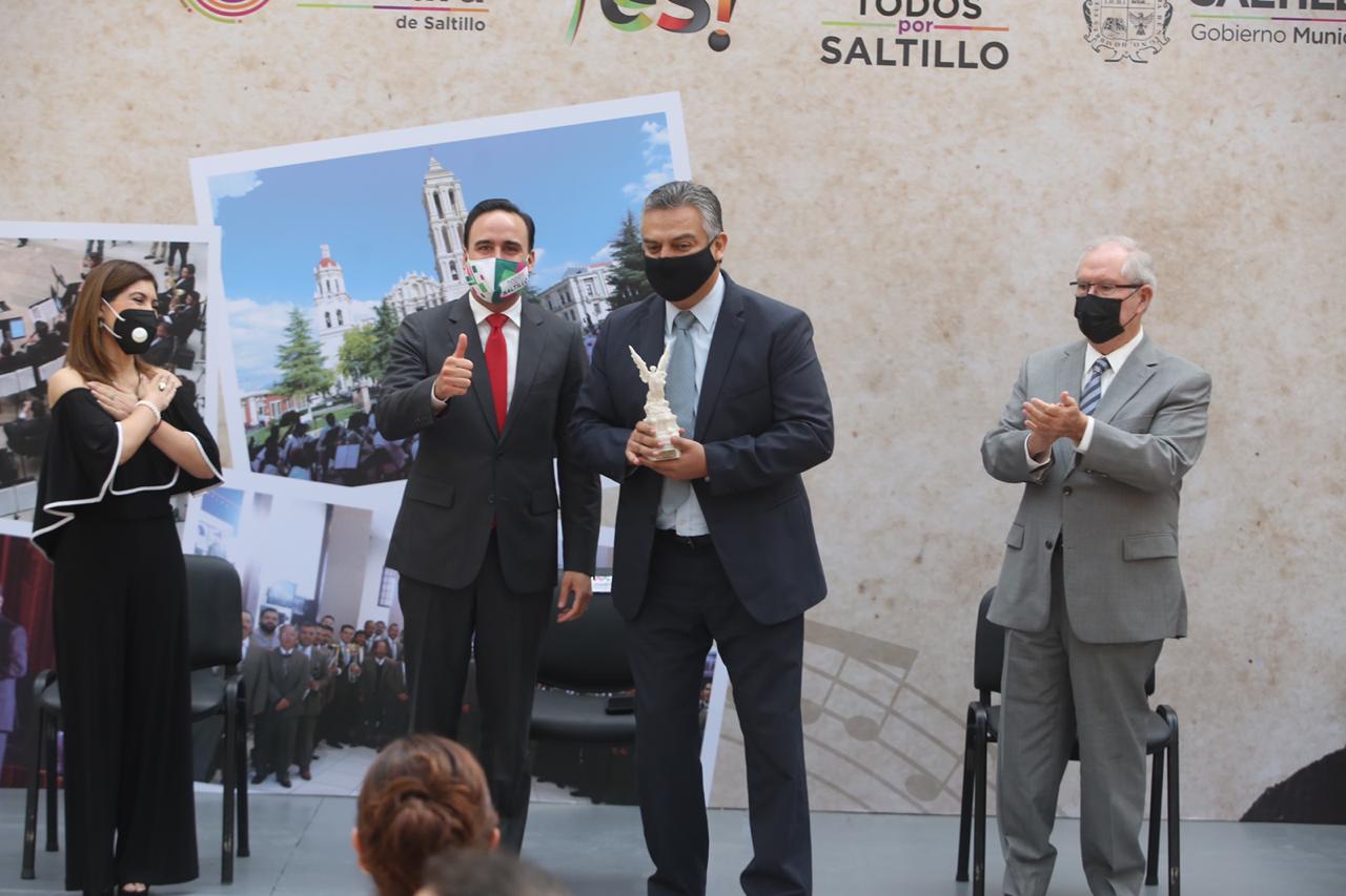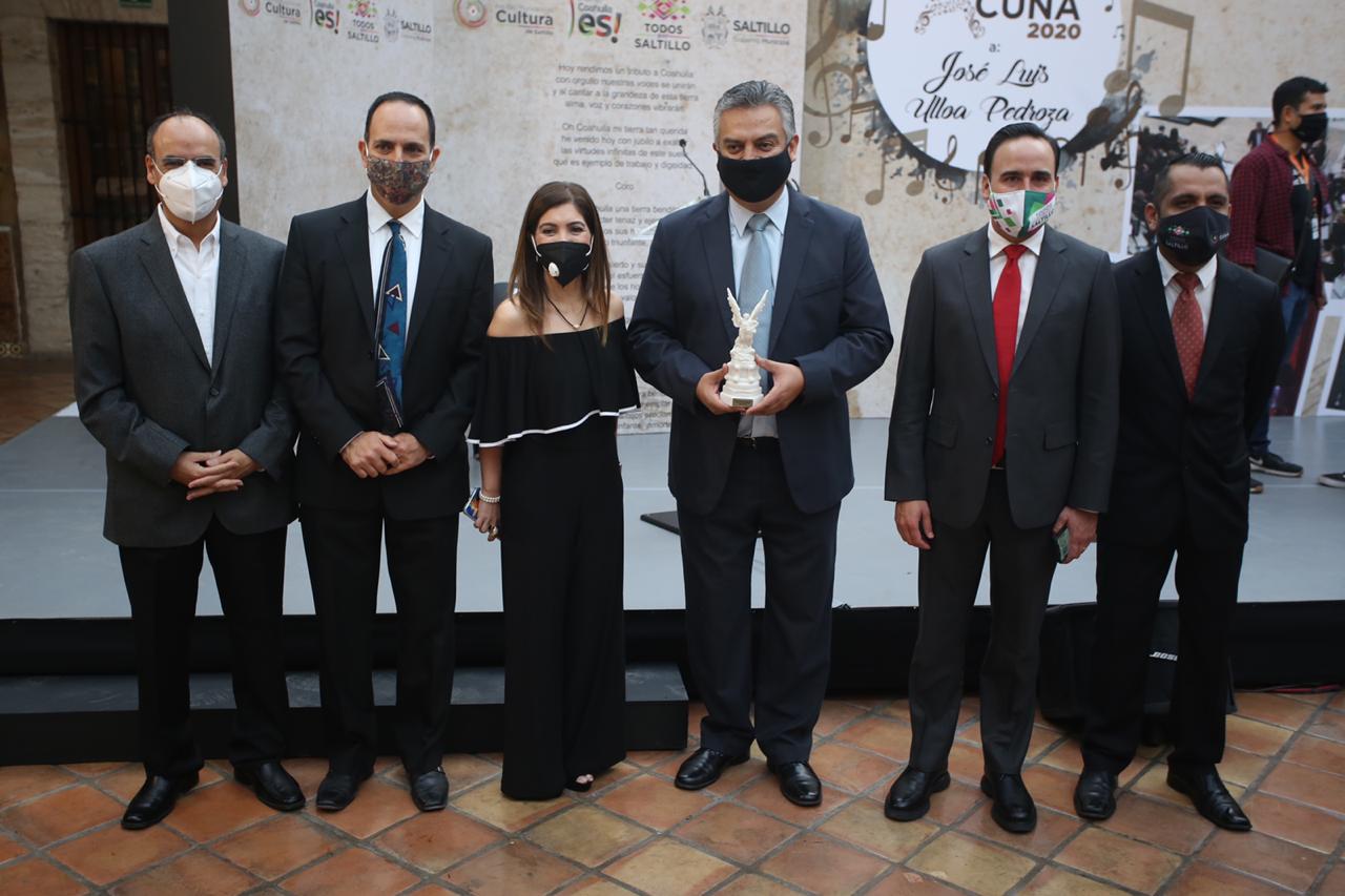 El alcalde de Saltillo, Manolo Jiménez Salinas, entregó la Presea Manuel Acuña en su edición 2020 al músico, compositor y arreglista José Luis Ulloa Pedroza, a quien le manifestó que se trata de un referente de la música a nivel estatal.