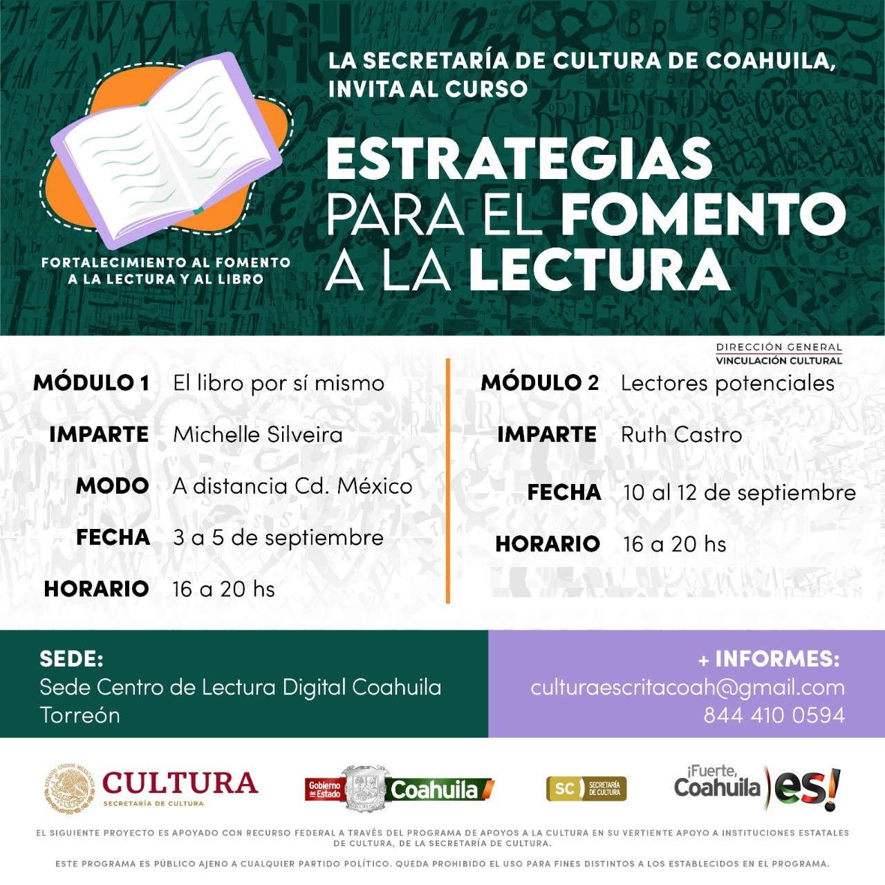 Al respecto, la Secretaria de Cultura, Ana Sofía García Camil, señaló que este curso se llevará a cabo en la Ciudad de Torreón y que será realizado en dos módulos.