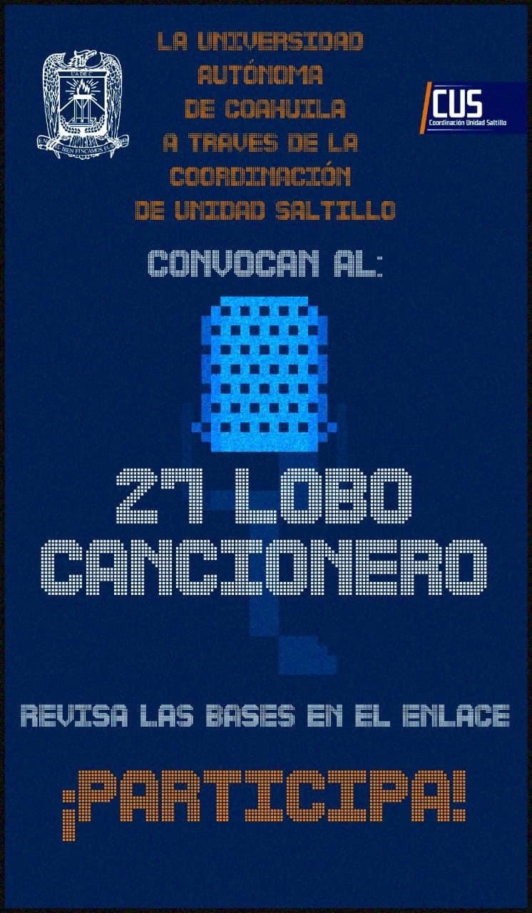 La Universidad Autónoma de Coahuila, a través de la Coordinación de Unidad Saltillo, invita a la comunidad universitaria a participar en la edición 27 de “Lobo Cancionero”, la convocatoria permanecerá abierta hasta el 11 de octubre de 2020 a las 23:59 horas, podrán participar todos los estudiantes que pertenezcan a la máxima casa de estudios, así como a las escuelas incorporadas a la misma.