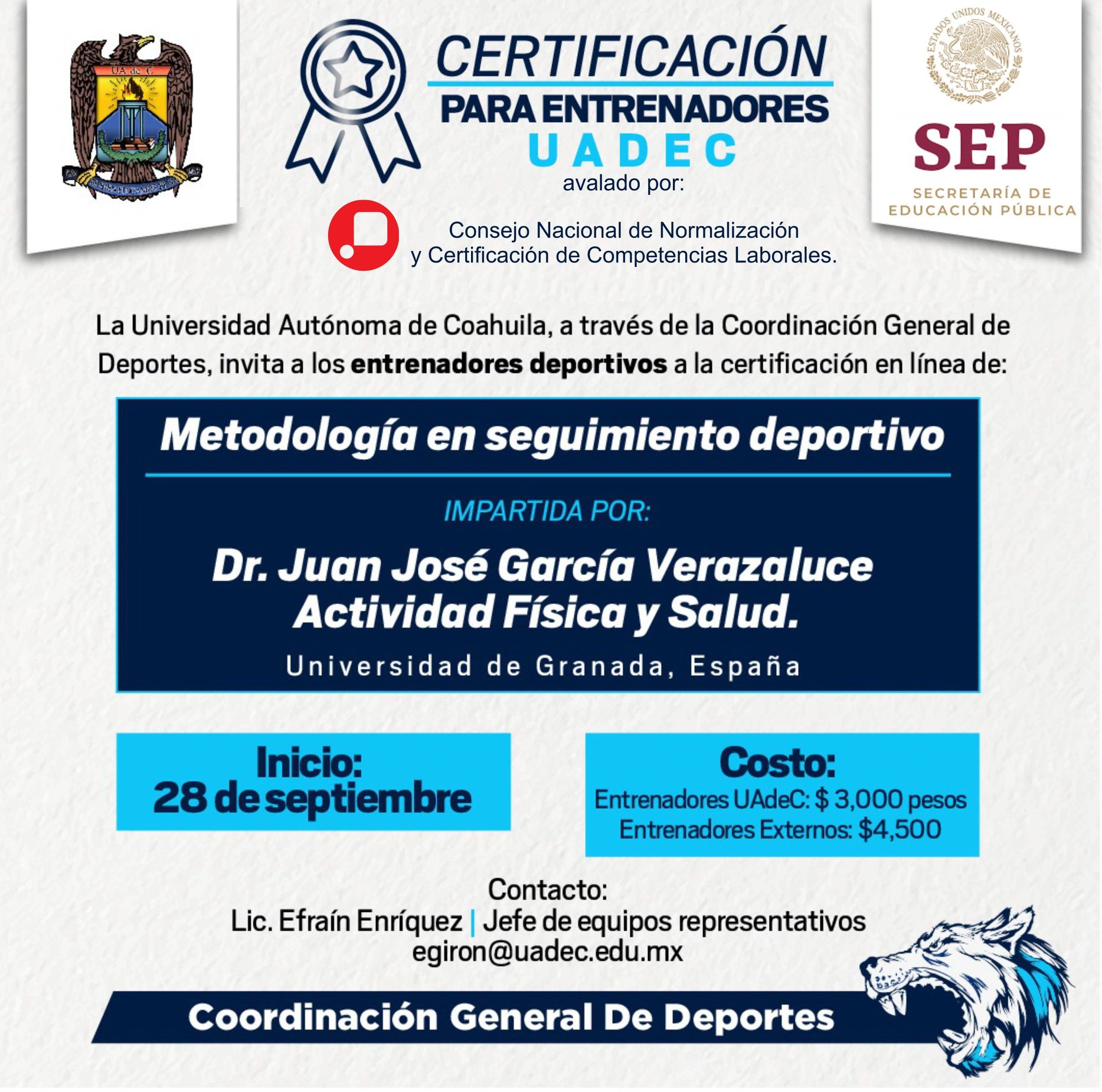 El costo es de 4 mil 500 pesos para entrenadores externos y 3 mil pesos para entrenadores de la UA de C; el pago podrá hacerse en una sola exhibición o ser descontado vía nómina en periodo 1 a 10 catorcenas; las inscripciones están abiertas a través del correo electrónico egiron@uadec.edu.mx.