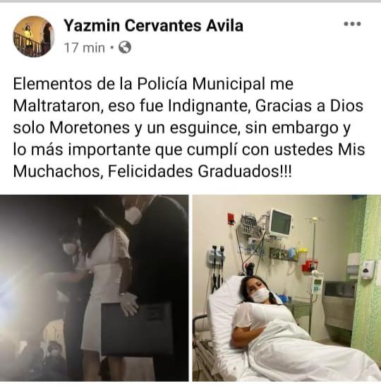 En una publicación en sus redes sociales aparece en una camilla de hospital y en el texto la directora culpa a los elementos de seguridad municipal de haberla agredido, sin embargo, hay una cantidad de videos y fotos en los que se muestra que en ningún momento fue tocada por los elementos, sino al contrario, ella fue quien los amenazó e insultó. Después subió a su vehículo y se retiró del lugar.