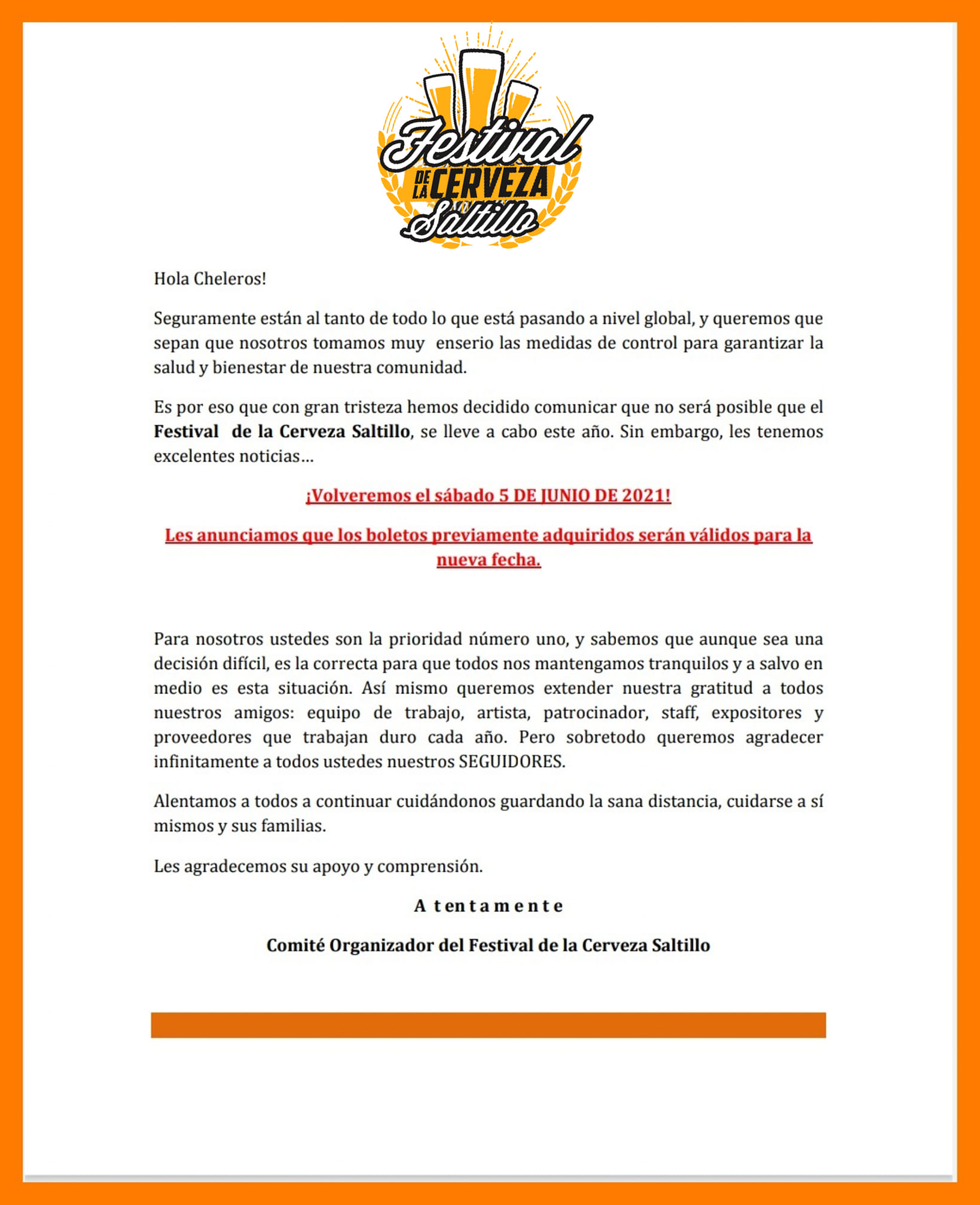 «Queremos que sepan que nosotros tomamos muy en serio las medidas de control para garantizar la salud y bienestar de nuestra comunidad. Es por eso que con gran tristeza hemos decidido comunicar que no será posible que el Festival de la Cerveza Saltillo se lleve a cabo este año», se lee en el documento.