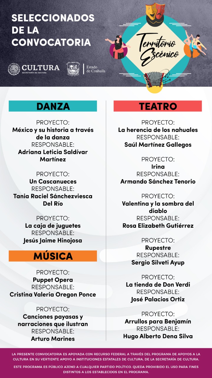 La Secretaría de Cultura de Coahuila (SC) informó que después de la deliberación del jurado ya se tiene a los seleccionados la convocatoria “Territorio Escénico”.