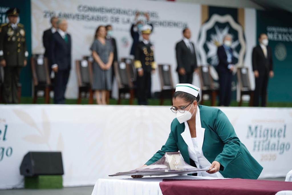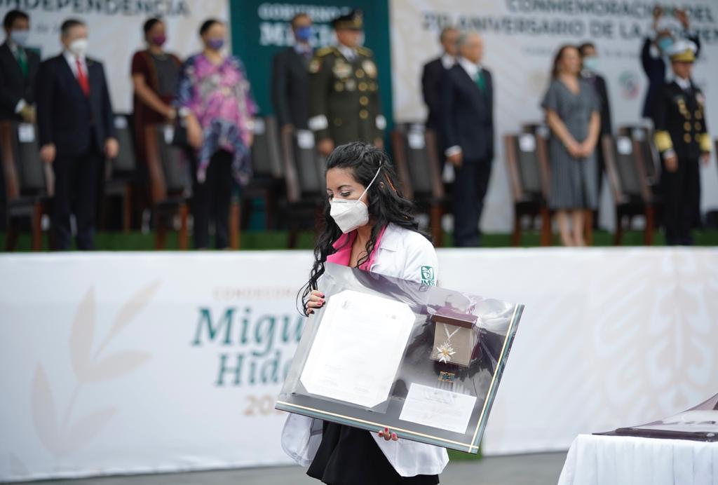 Por su actitud heroica, profesionalismo, alto nivel de compromiso y servicios prestados a la patria ante la emergencia sanitaria por COVID-19, el Gobierno de México entregó a personal médico y de enfermería de todo el sector salud 58 preseas en Grado Collar de la Condecoración Miguel Hidalgo, de las cuales 22 fueron para trabajadores del Instituto Mexicano del Seguro Social (IMSS).