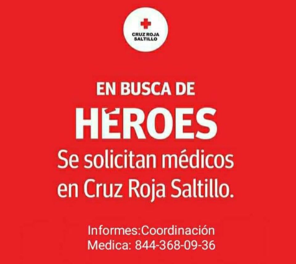 A través de sus redes sociales, la Cruz Roja Delegación Saltillo está haciendo un llamado a médicos de la localidad para que se sumen a sus filas con el objetivo de fortalecer sus servicios de consulta en esta capital.