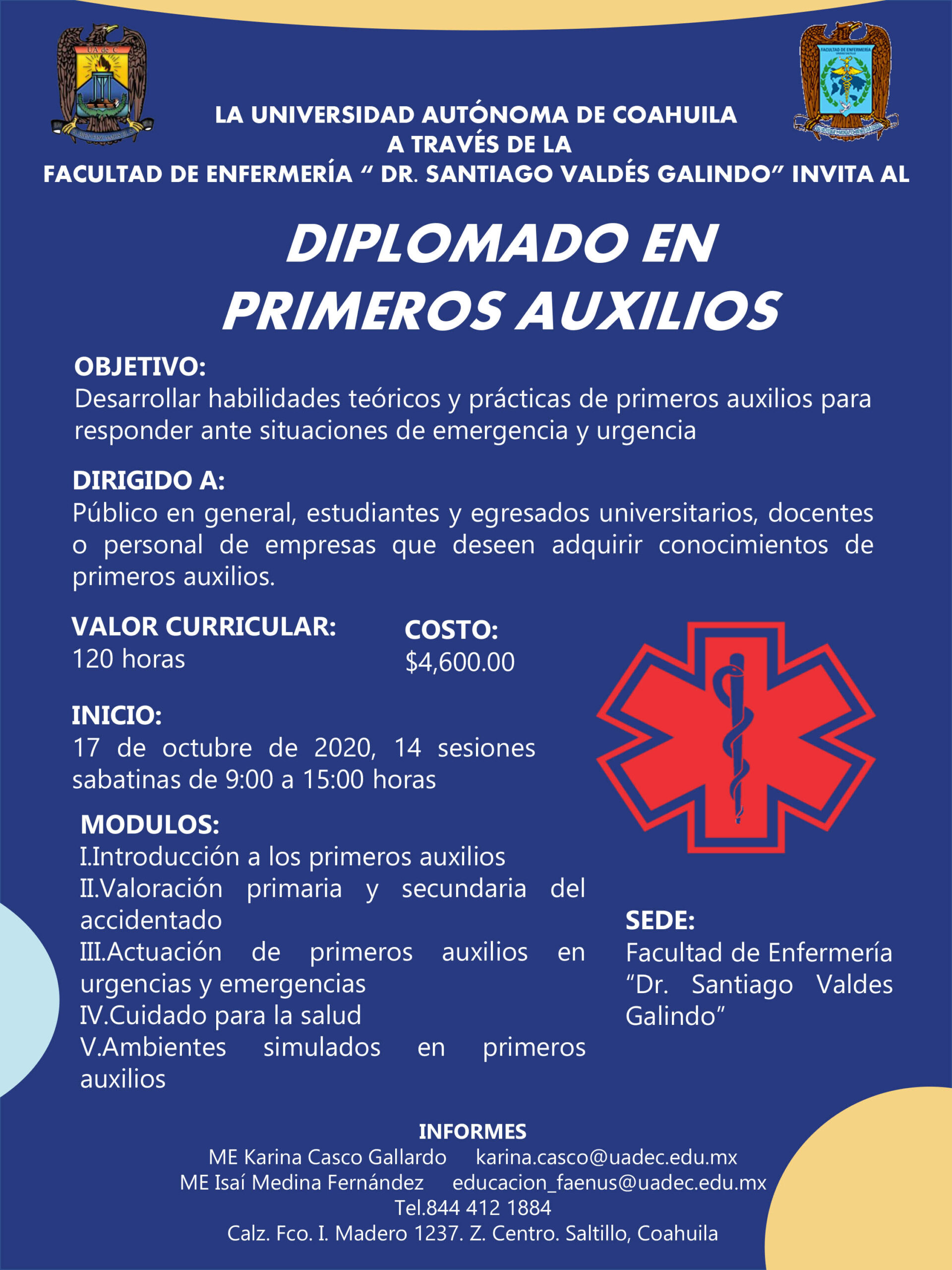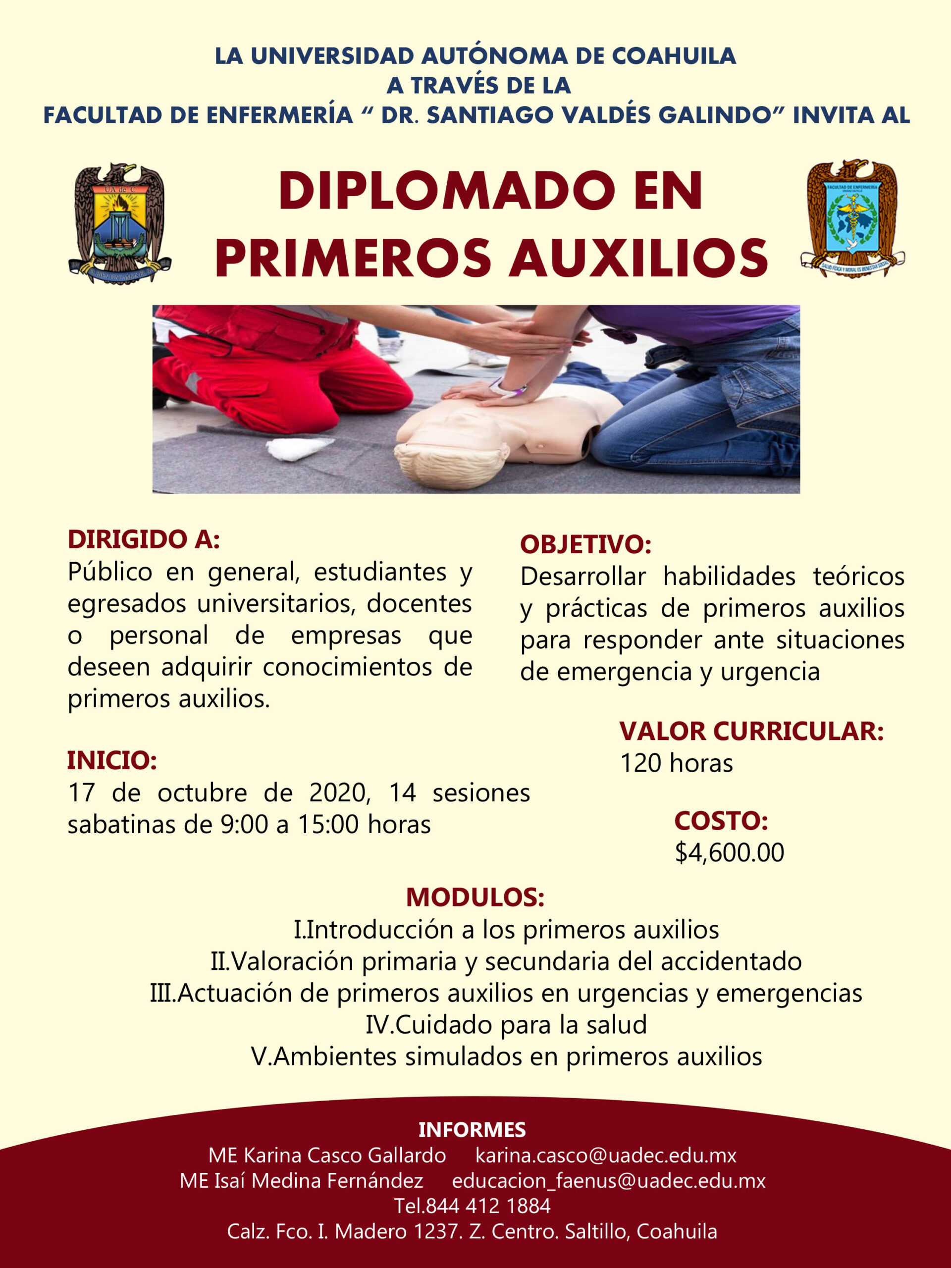 El objetivo del diplomado es desarrollar habilidades teórico-prácticas de primeros auxilios para responder ante situaciones de emergencia y urgencia, y se divide en cinco módulos, comprendidos en 14 sesiones sabatinas de 9:00 a 15:00 horas en las instalaciones de la Facultad, ubicadas en Calzada Francisco I. Madero 1237 en la Zona Centro de Saltillo.