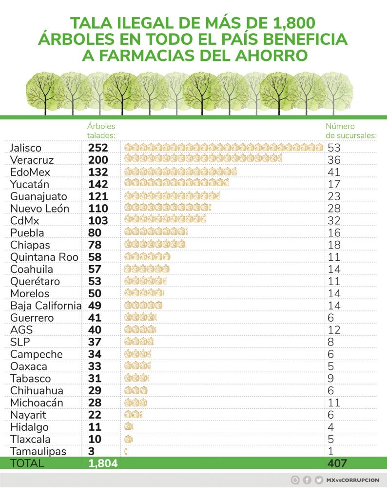 En abril de 2019, Mexicanos Contra la Corrupción y la Impunidad (MCCI), Tojil y Los Supercívicos, dieron a conocer que Farmacias del Ahorro pudo haber participado directamente en la tala ilegal de más de 1,804 árboles en 407 sucursales en todo el país, entre ellas 57 árboles en Coahuila en 14 sucursales. Esto, con el fin de construir nuevas farmacias o ampliar las existentes. De lo anterior se dio cuenta incluso en medios extranjeros como The New York Times.