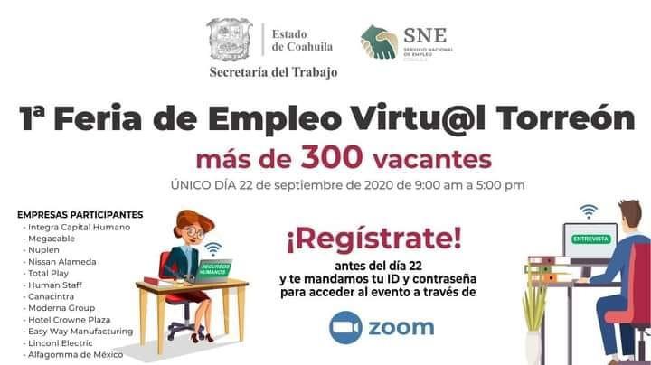 Torreón.- El Gobierno de Coahuila, a través de la Secretaría del Trabajo y el Servicio Nacional del Empleo (SNE) Laguna, invita a la Primera Feria Virtual de Empleo Torreón 2020.