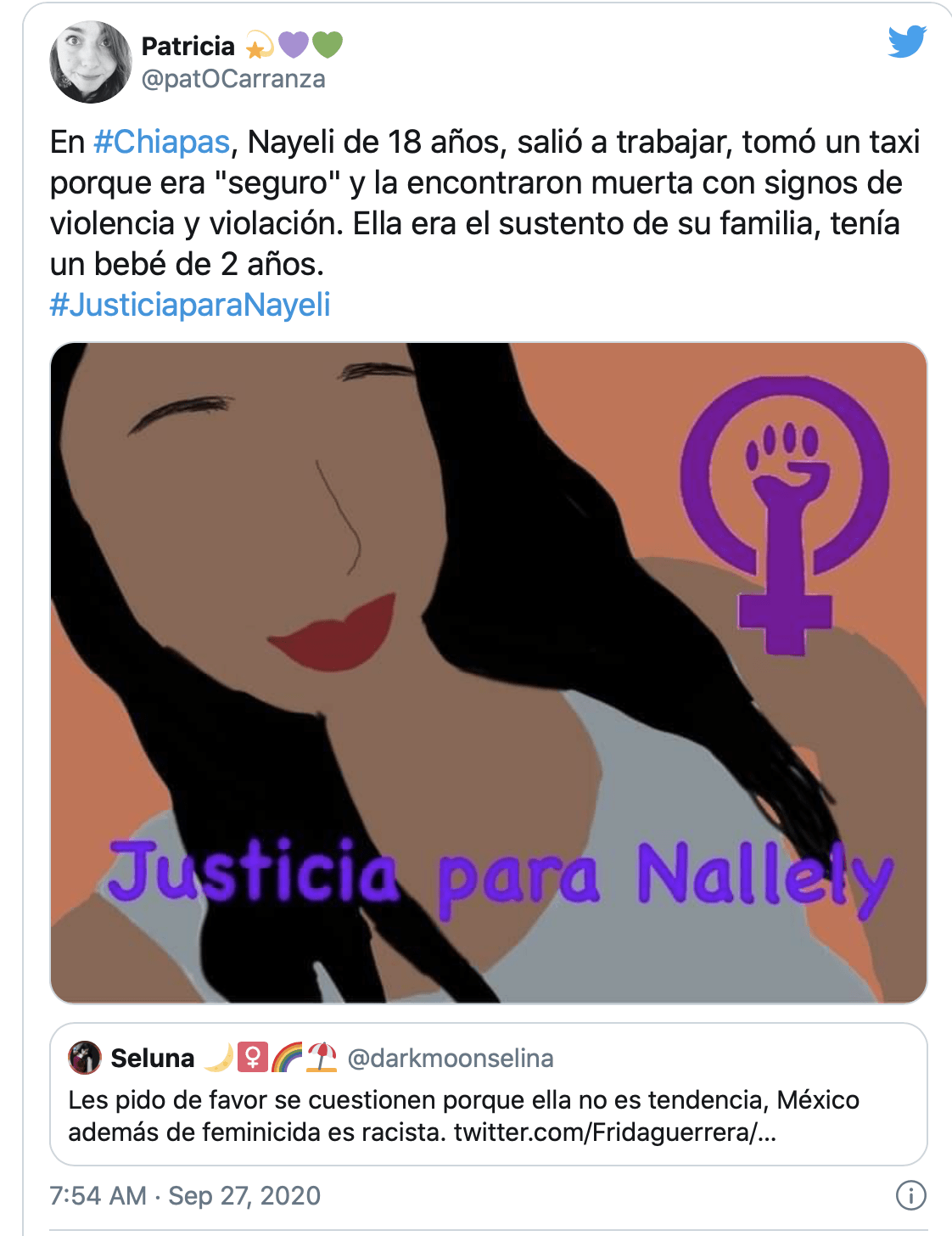 Nayeli era una joven madre de 18 años que vivía en Chiapas. Esta mujer tomó un taxi para dirigirse a su trabajo; esa fue la última vez que su familia la vio con vida, pues el pasado viernes se dio a conocer que su cuerpo fue abandonado en una carretera del estado.