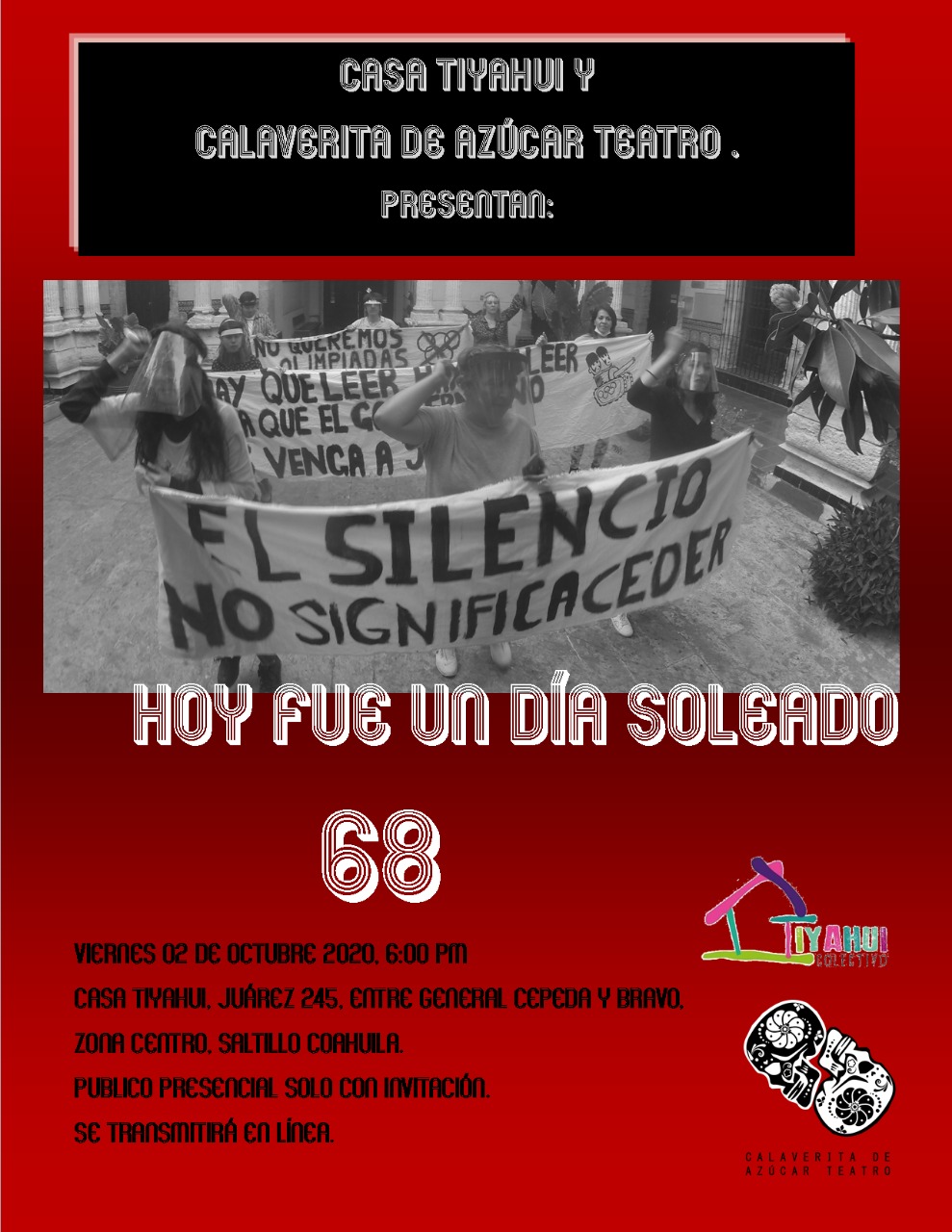 Para recordar al movimiento estudiantil y su dispersión, el 2 de octubre de 1968, tras la represión armada por indicación del gobierno mexicano de ese entonces, que cobró la vida de entre 300 y 500 jóvenes estudiantes y civiles en la Plaza de las Tres Culturas de Tlatelolco, Casa Tiyahui y Calaverita de Azúcar Teatro presentarán el performance escénico «Hoy fue un Día Soleado», este viernes a las 6:00 de la tarde, por medio de la página de Facebook del primer colectivo mencionado.