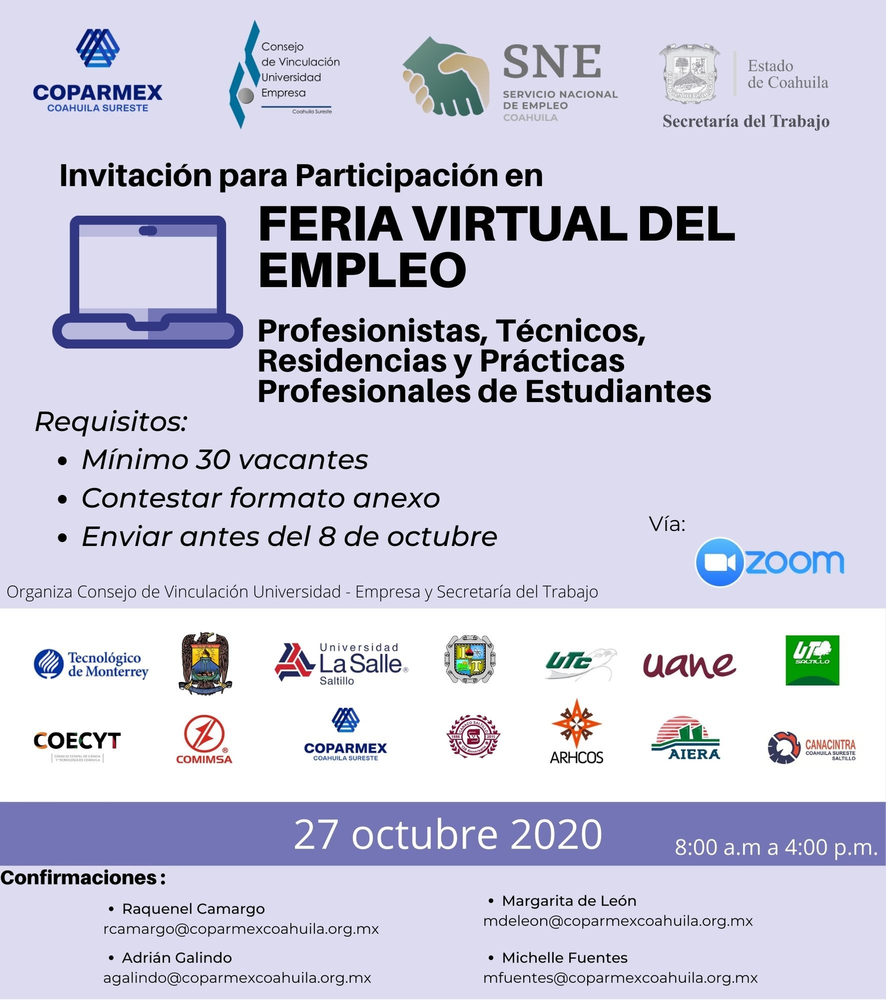 El próximo 27 de octubre de 8:00 de la mañana a 4:00 de la tarde tendrá lugar la Feria Virtual del Empleo organizada por el Consejo de Vinculación Universidad Empresa y la Secretaría del Trabajo para profesionistas y técnicos, así como también para estudiantes que estén por realizar sus residencias o prácticas profesionales.