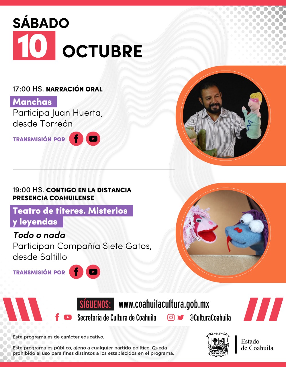 Mientras que el día 10 grande y pequeños pueden acceder al Teatro de títeres. Misterios y leyendas Todo o nada con la Compañía Siete Gatos, desde Saltillo, Coahuila en punto de las 19:00 horas.