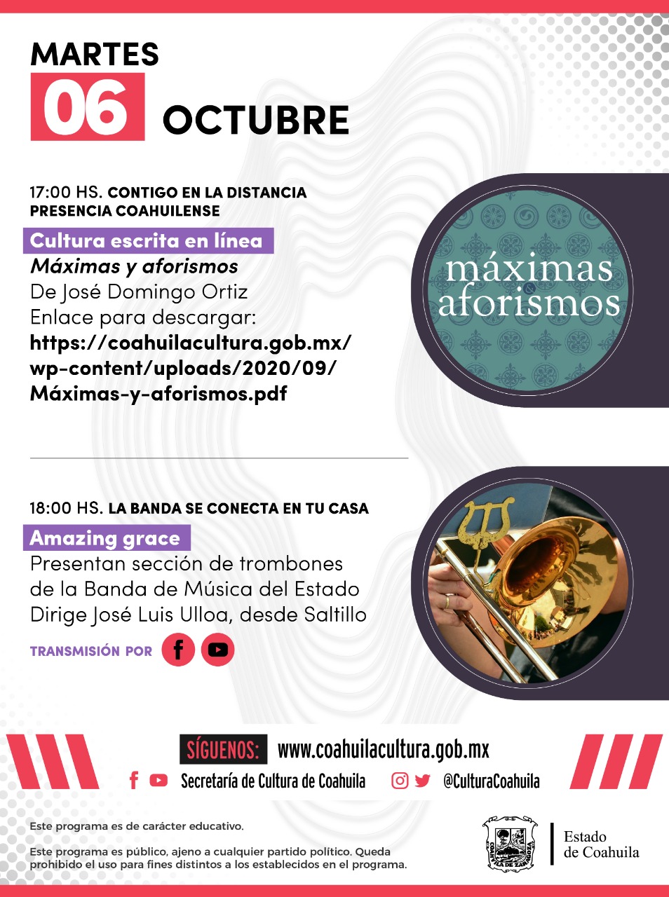 Este mes en “La Cultura Nos Une En Línea” tenemos grandes actividades como “Sol de maíz”, de Roberto Márquez, con la participación del Grupo Takinkai, de la UA de C, a las 18:00 horas, y el “Amazing grace”, con la sección de trombones de la Banda de Música del Estado, este martes a las 18:00 horas.